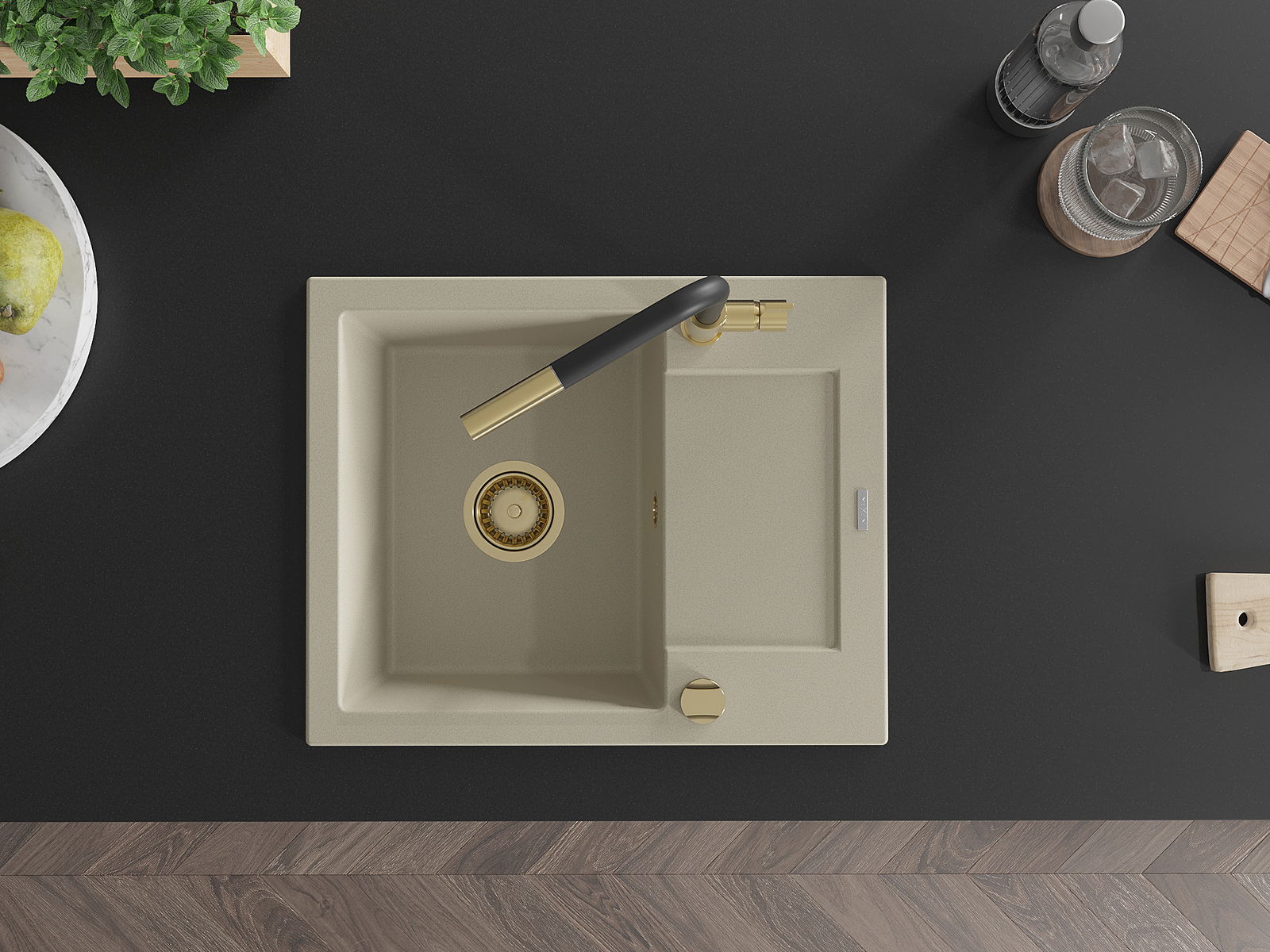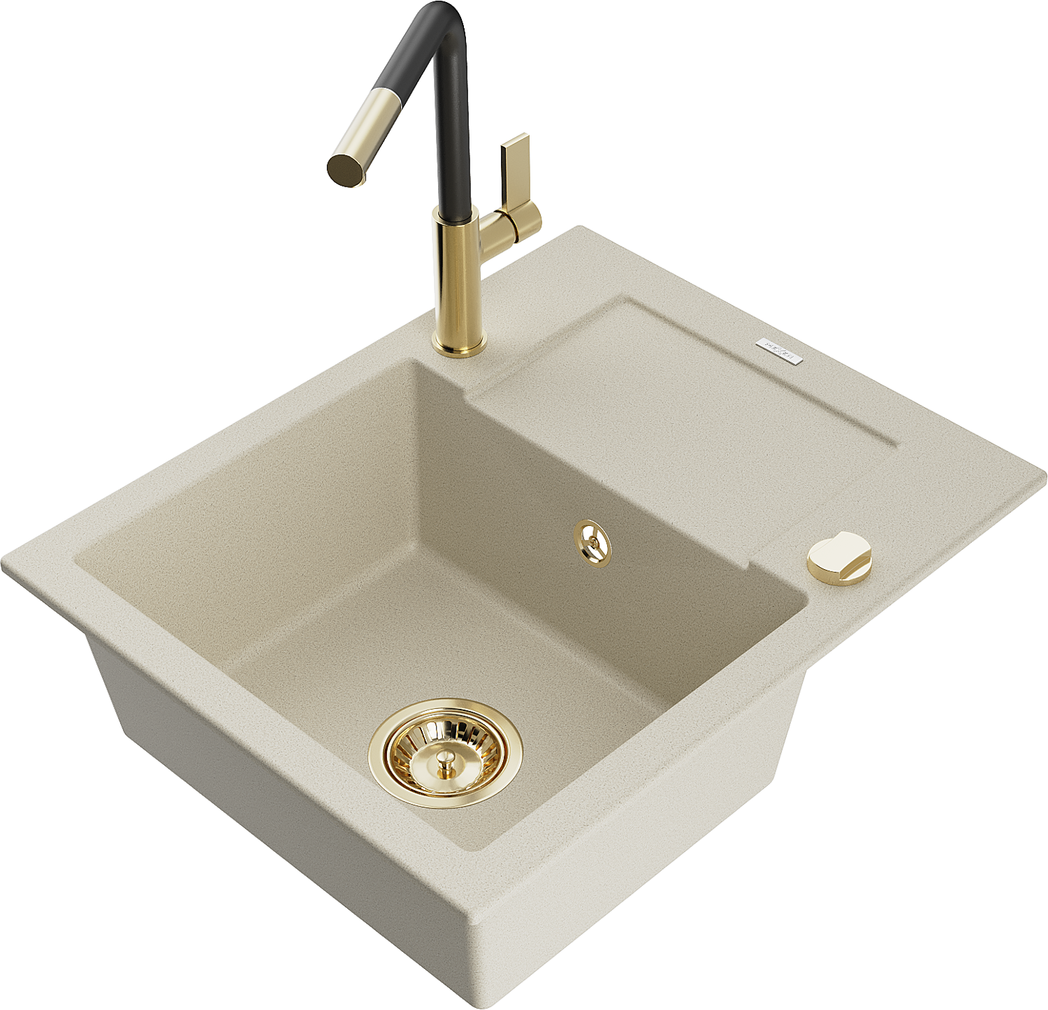 Mexen Enzo lavello da cucina in granito a 1 vasca con sgocciolatoio e rubinetto da cucina Flora, beige - 6506-69-670401-57-G