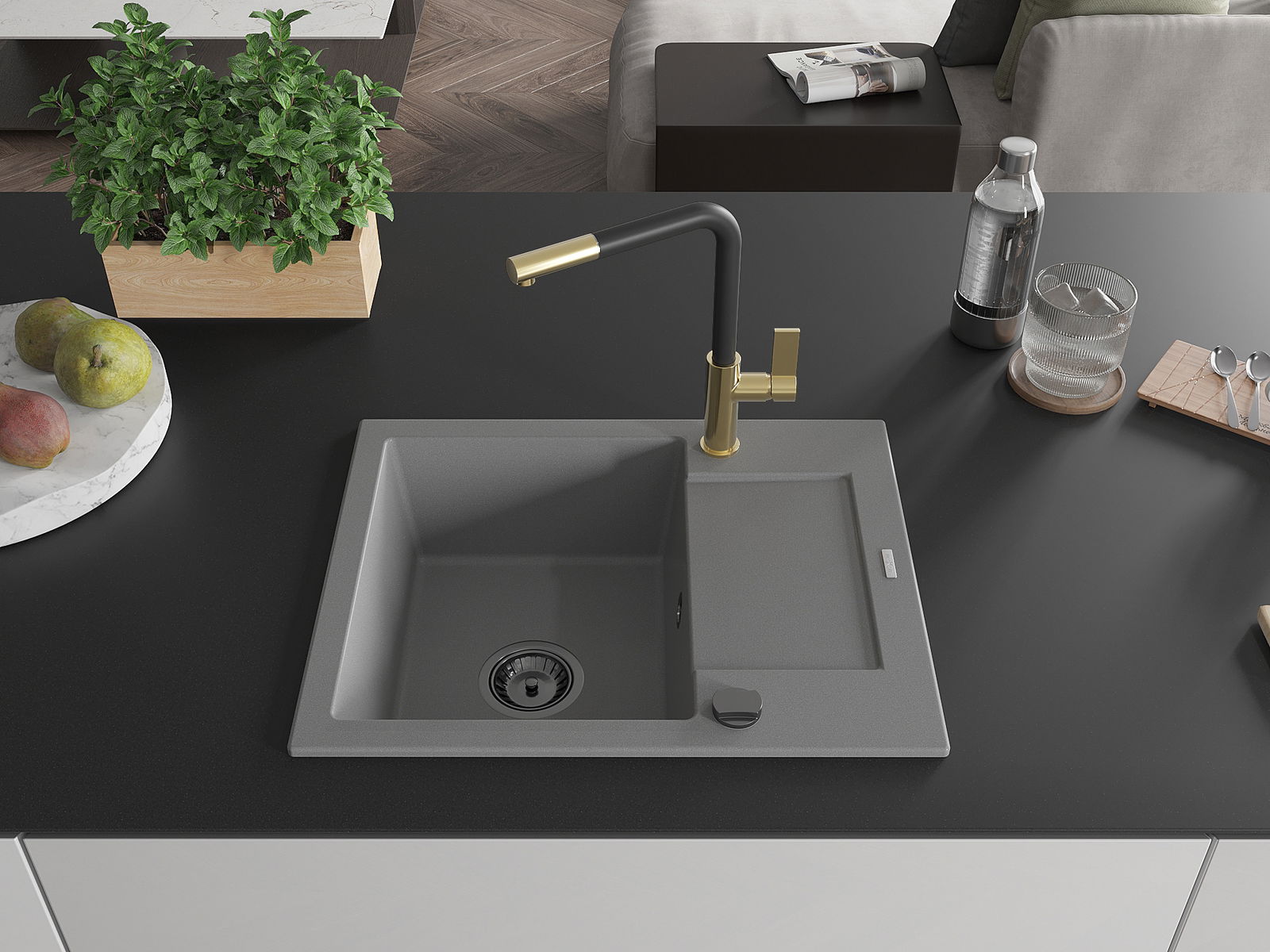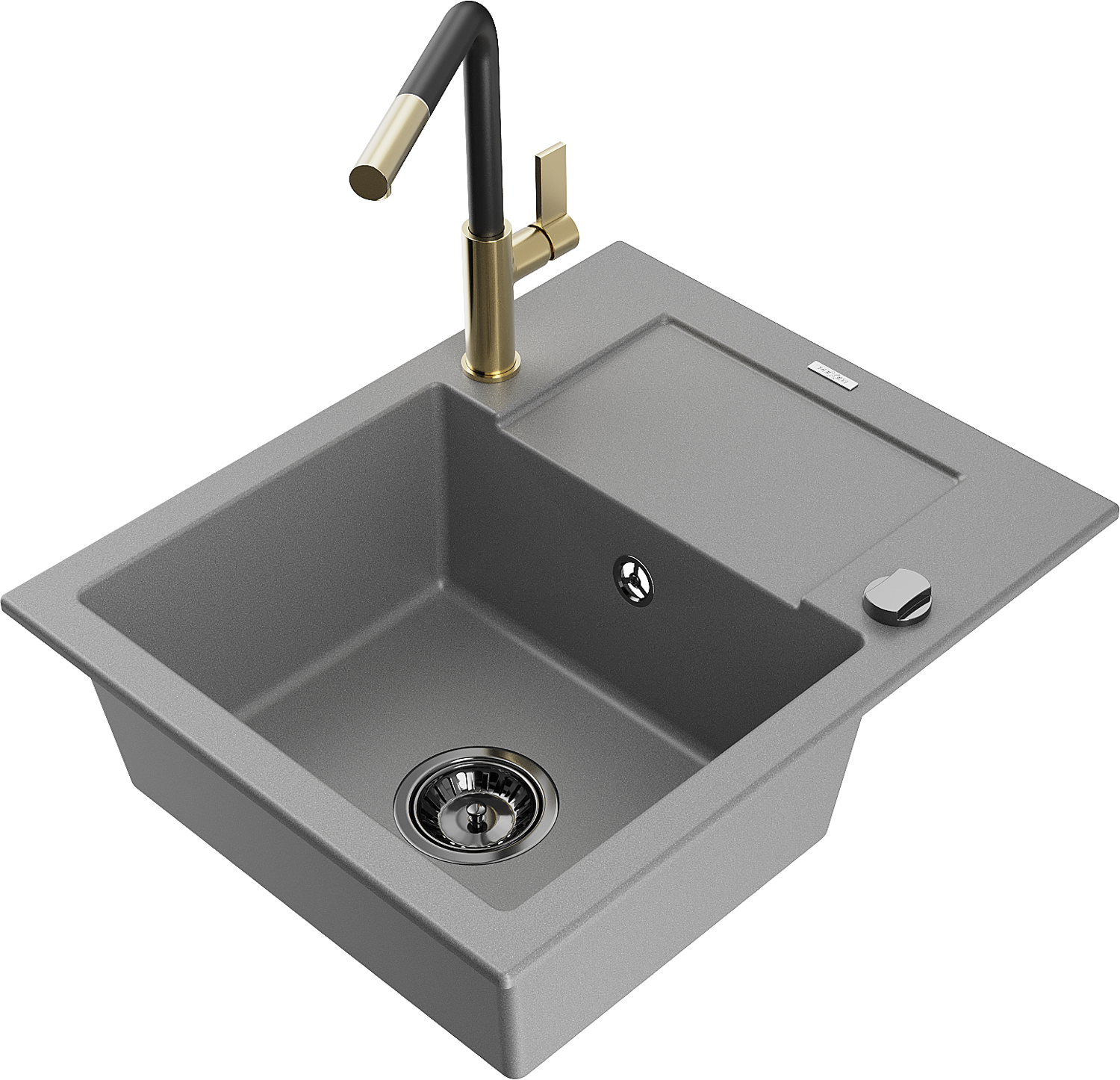 Mexen Enzo lavello da cucina in granito a 1 vasca con sgocciolatoio e miscelatore cucina Flora, grigio - 6506-71-670401-57-B