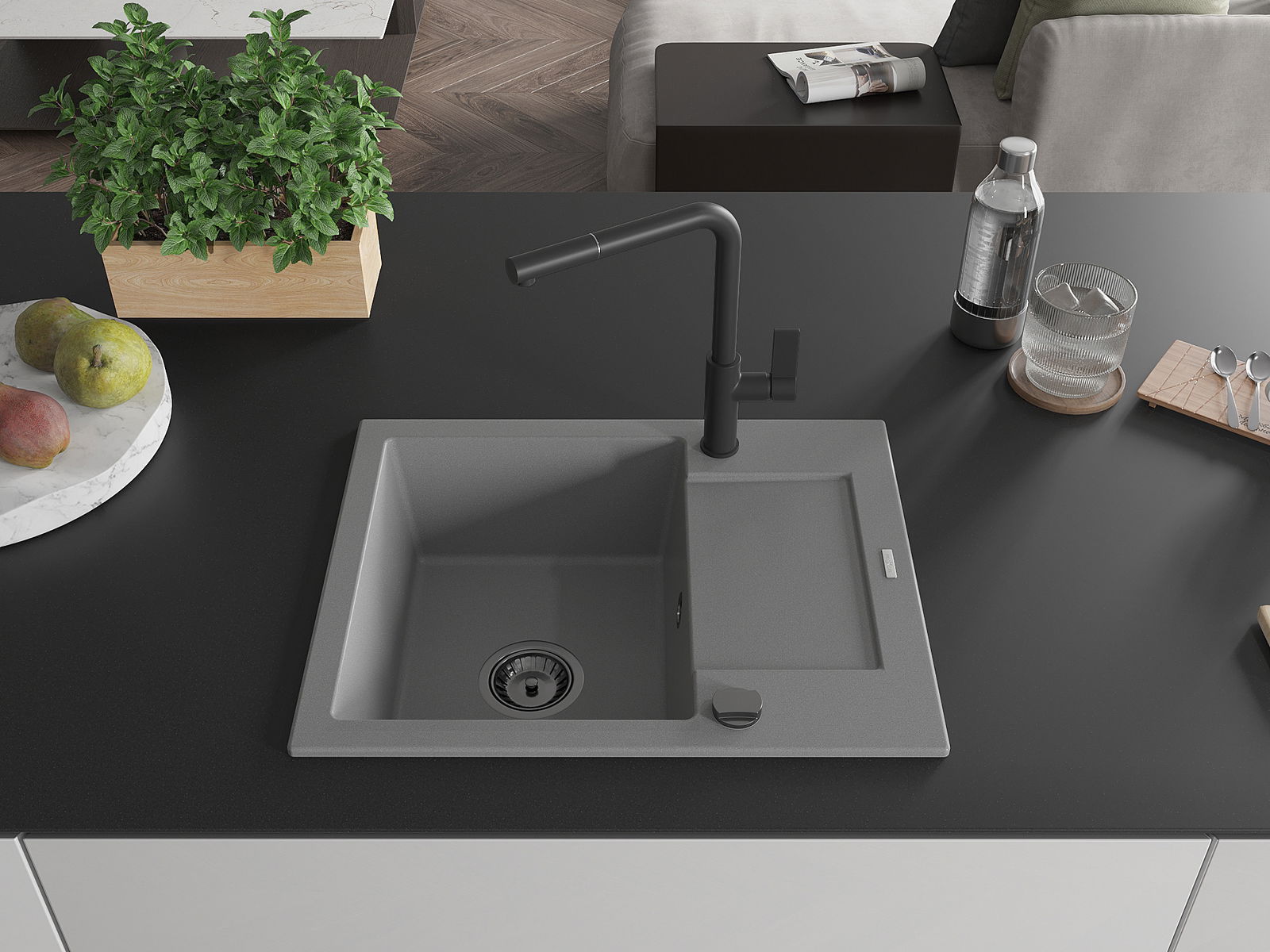 Mexen Enzo lavello in granito a 1 vasca con scolapiatti e rubinetto da cucina Flora, grigio - 6506-71-670401-70-B