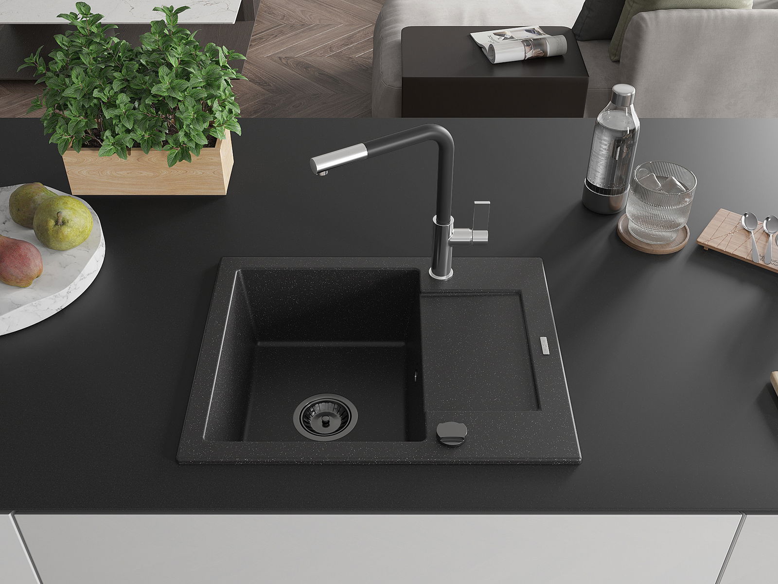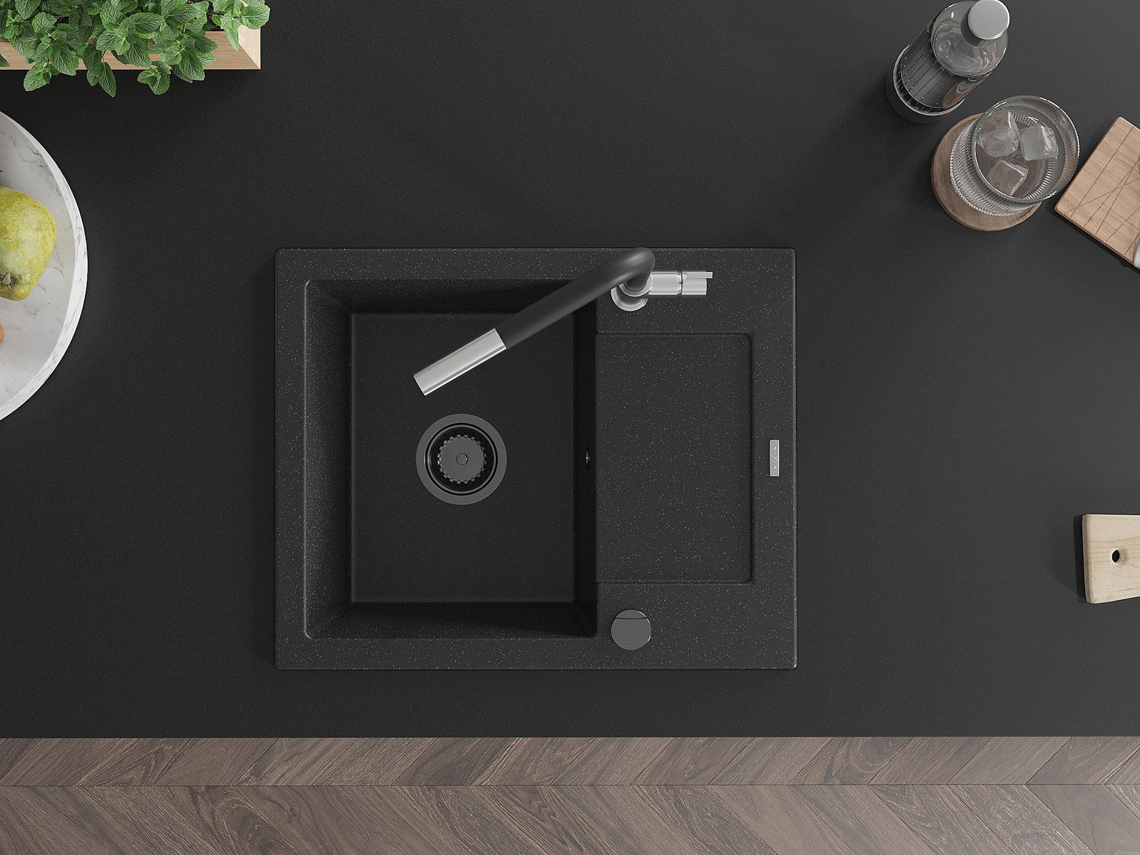 Mexen Enzo lavello in granito a 1 vasca con scolapiatti e rubinetto da cucina Flora, nero/argento metallico
