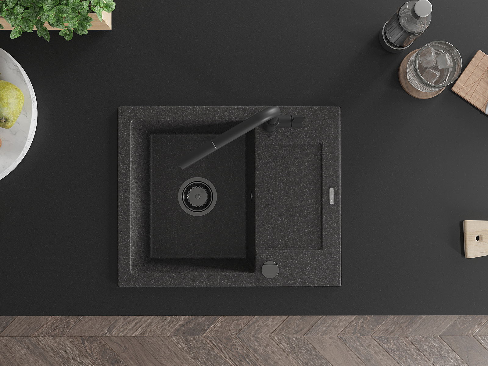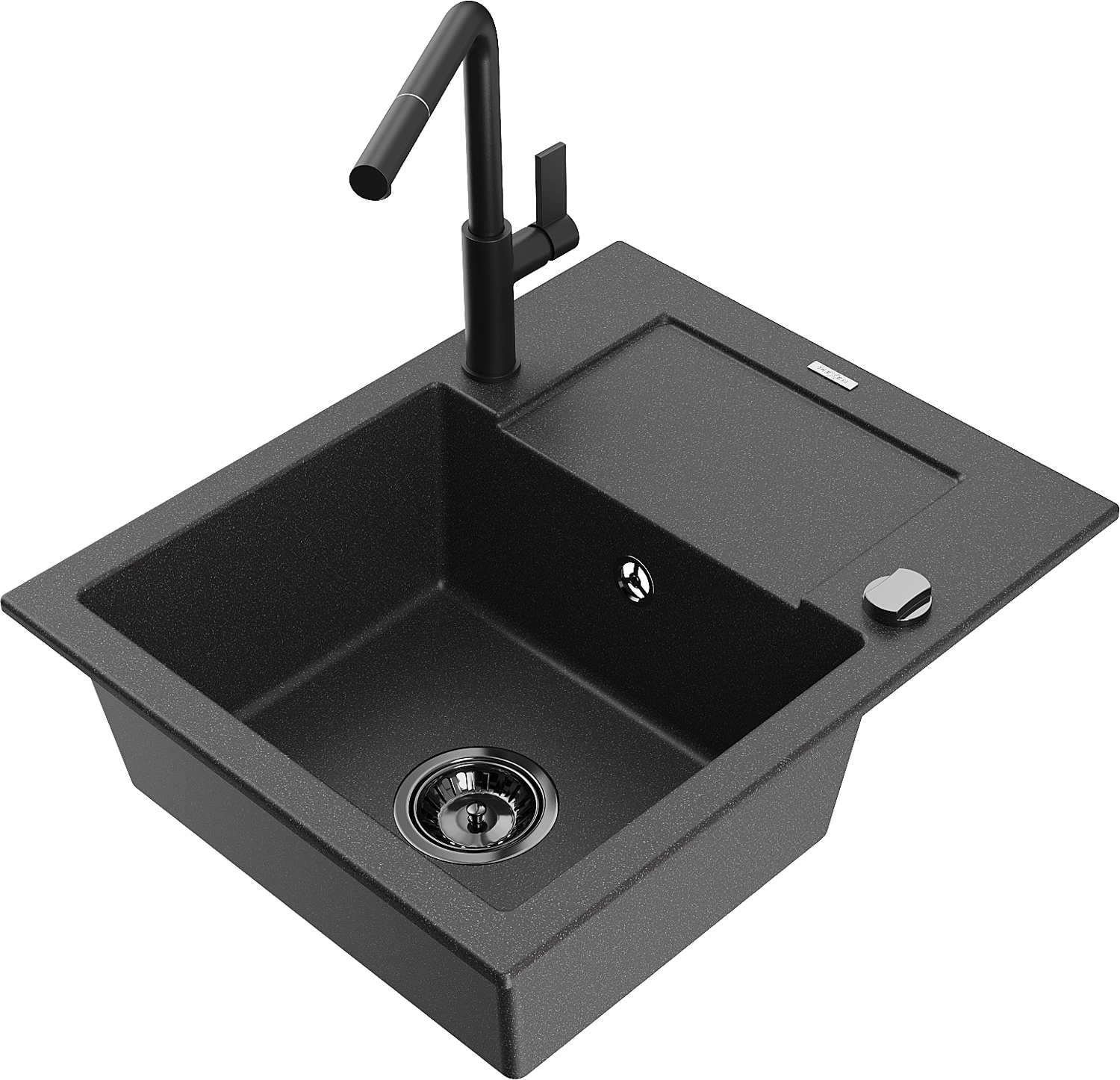 Mexen Enzo lavello in granito a 1 vasca con scolapiatti e rubinetto da cucina Flora, nero maculato - 6506-76-670401-70-B