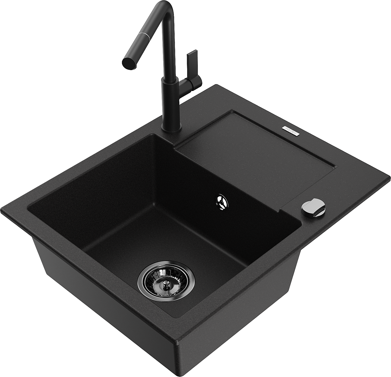 Mexen Enzo lavello in granito a 1 vasca con scolapiatti e rubinetto da cucina Flora, nero - 6506-77-670401-70-B