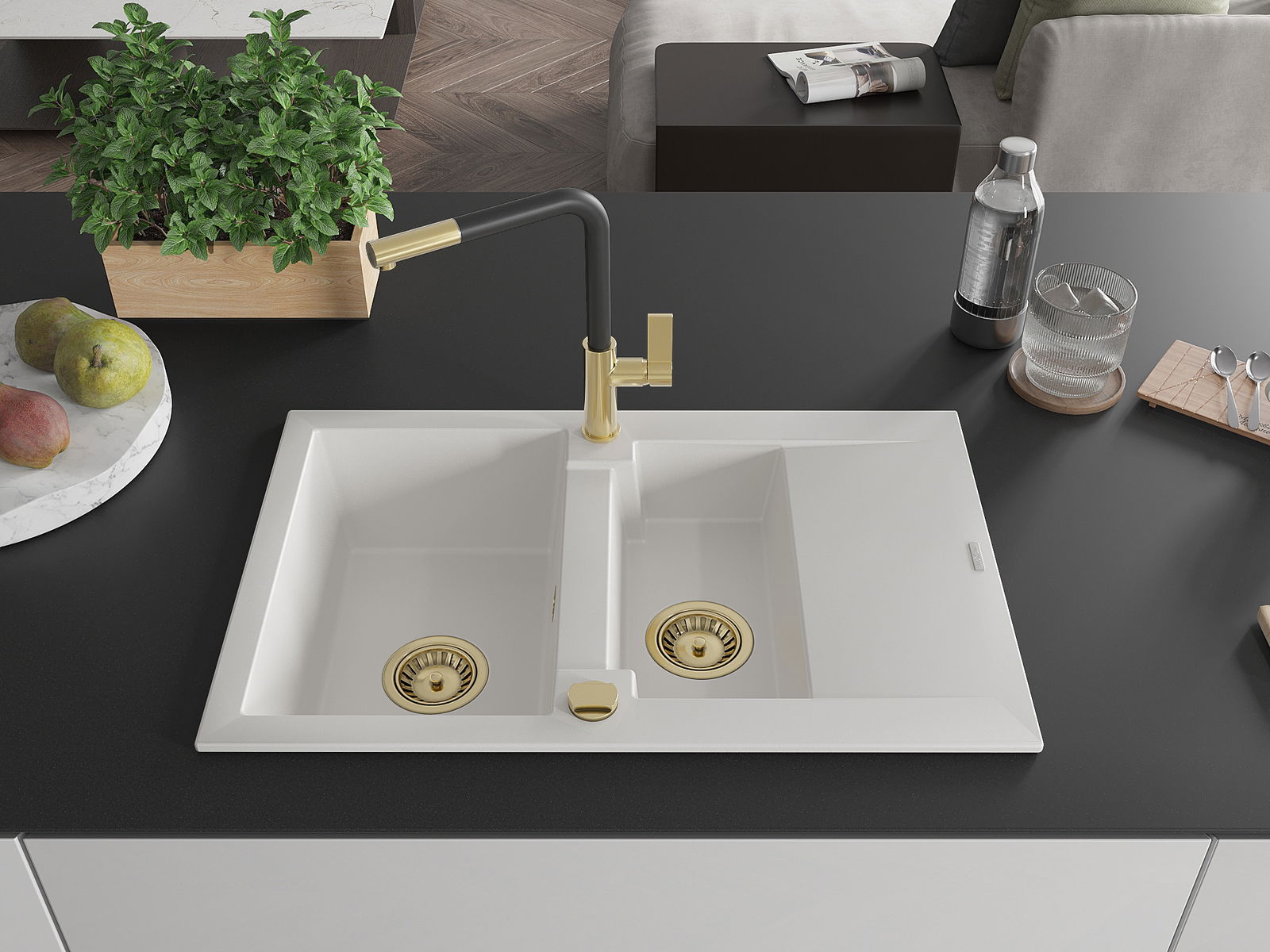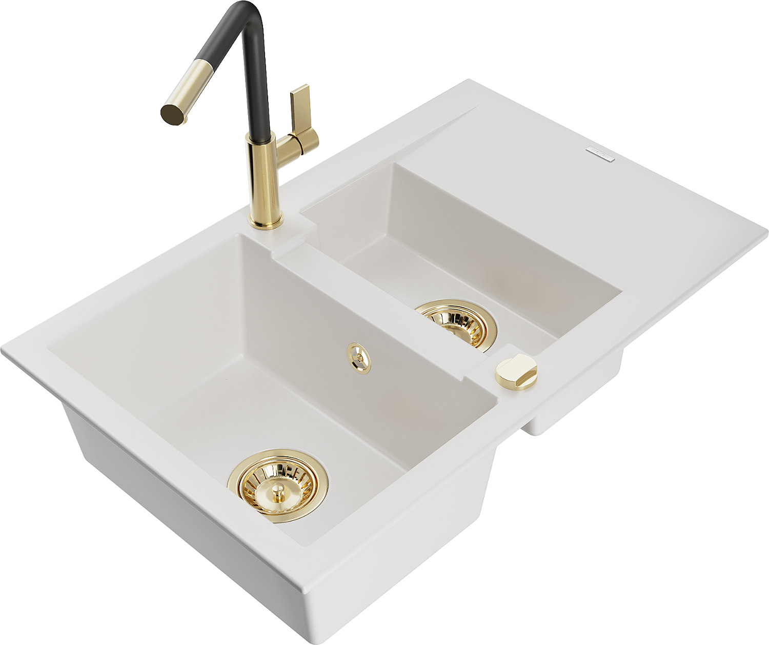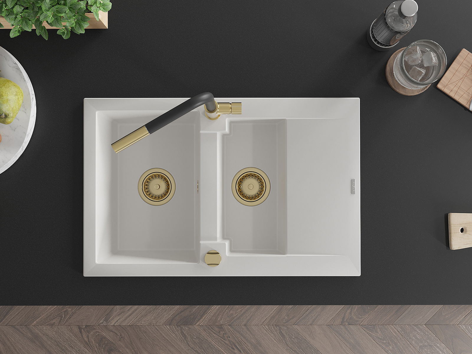 Mexen Gaspar lavello in granito 1,5 vasche con sgocciolatoio e miscelatore cucina Flora, bianco - 6507-20-670401-57-G