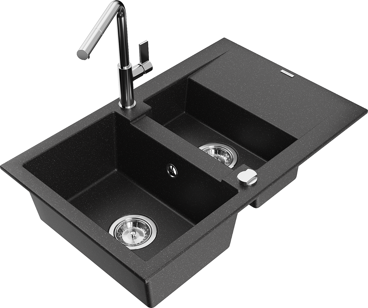 Mexen Gaspar lavello in granito 1,5 vasca con scolapiatti e rubinetto da cucina Flora, nero/argento - 6507-73-670401-00