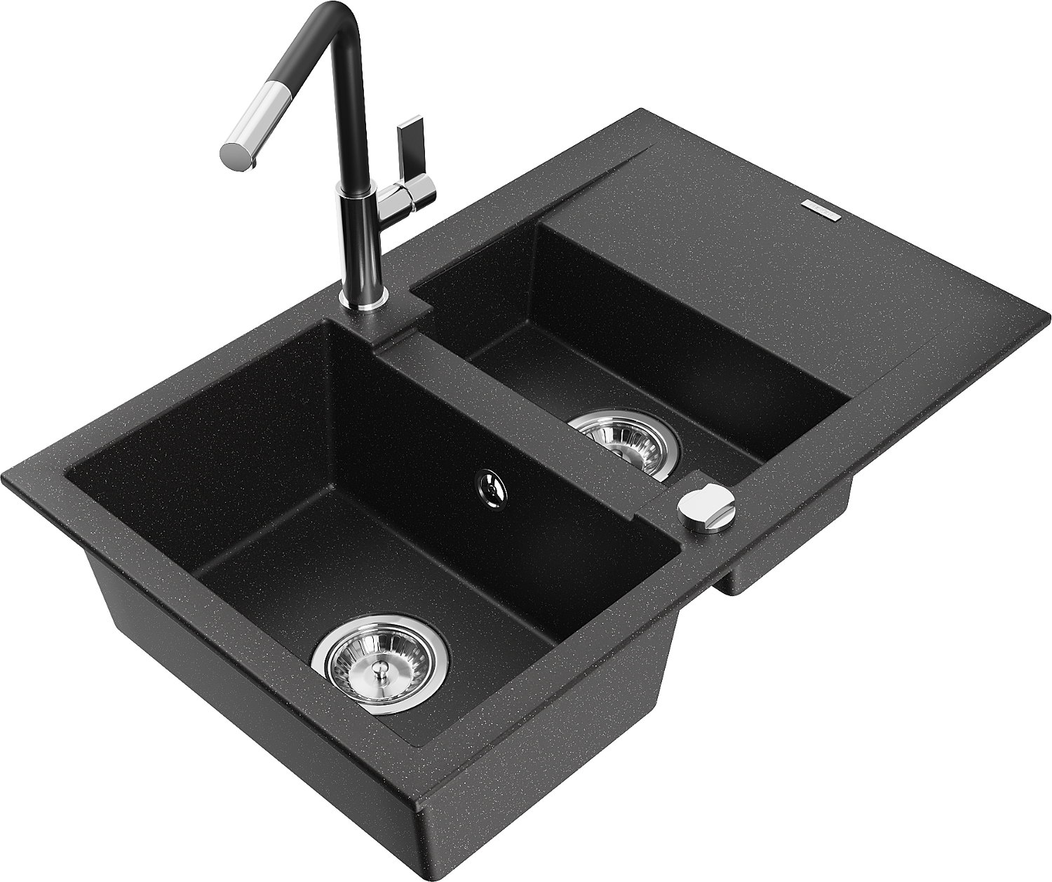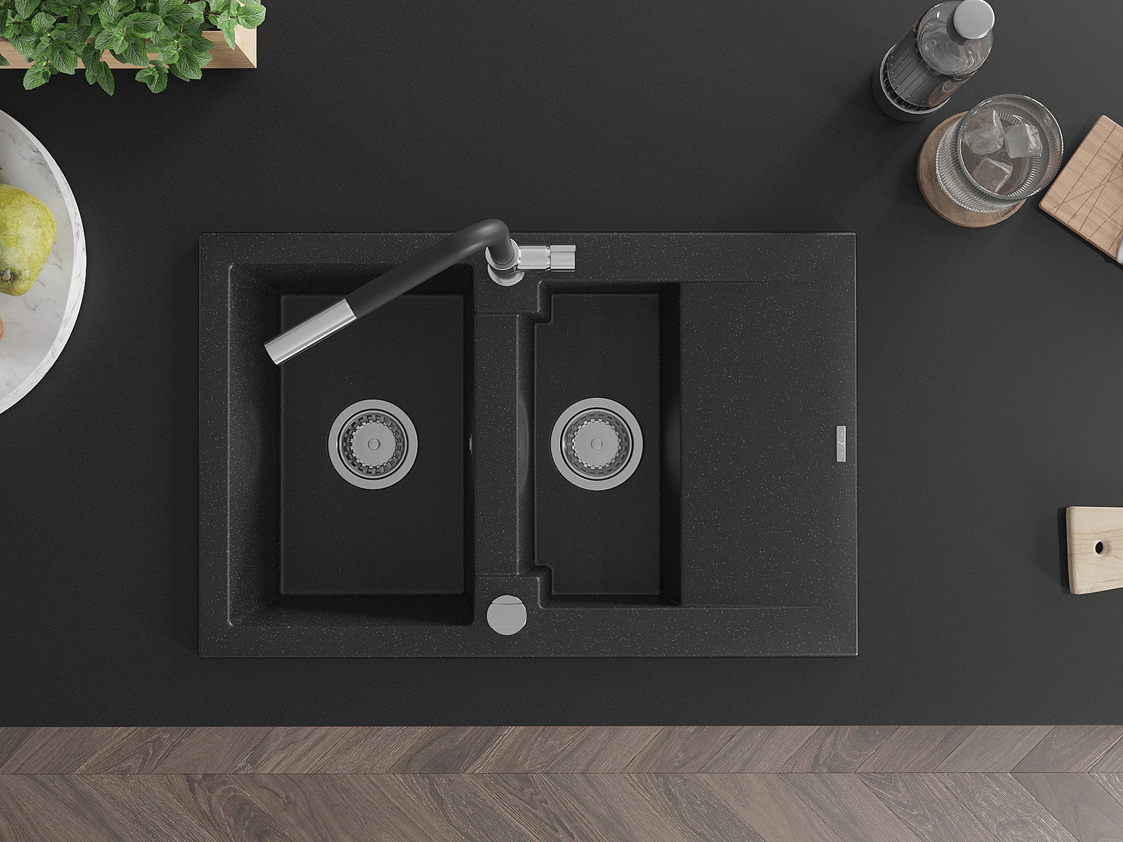 Mexen Gaspar lavello in granito 1,5 vasca con scolapiatti e rubinetto da cucina Flora, nero/argento - 6507-73-670401-07