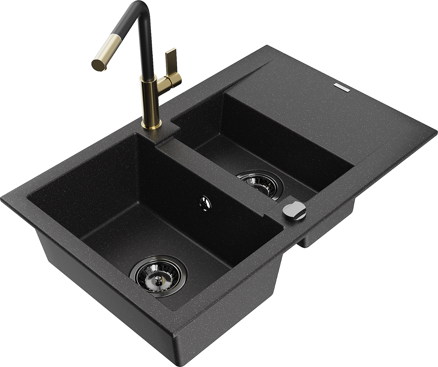 Mexen Gaspar lavello in granito 1,5 vasche con scolapiatti e rubinetto cucina Flora, nero/argento - 6507-73-670401-57-B