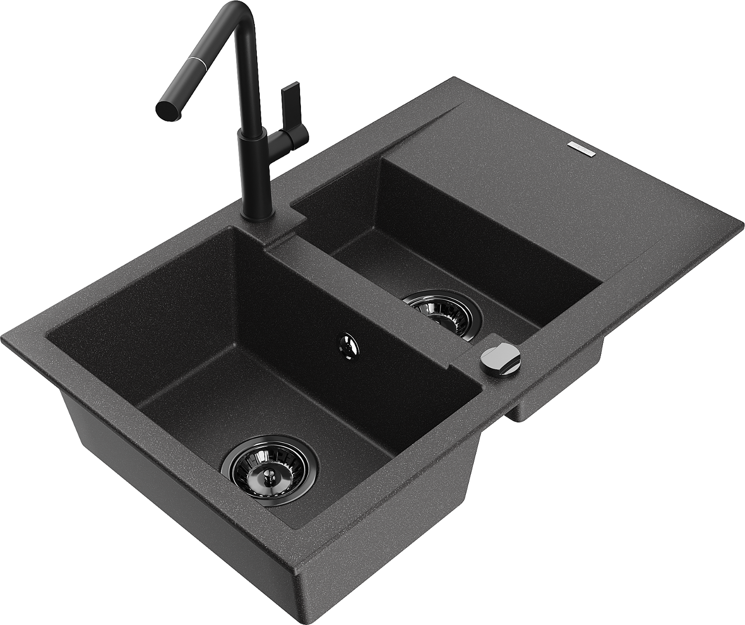 Mexen Gaspar lavello in granito 1,5 vasca con scolapiatti e rubinetto da cucina Flora, nero maculato - 6507-76-670401-70-B