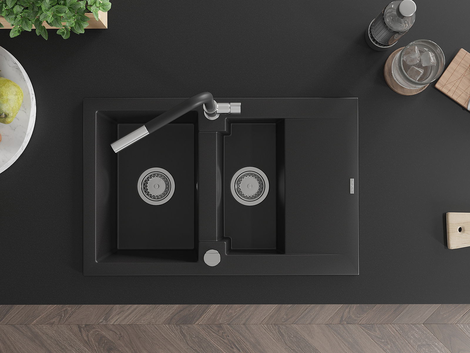Mexen Gaspar lavello in granito da 1,5 vasche con scolapiatti e rubinetto da cucina Flora, nero - 6507-77-670401-07
