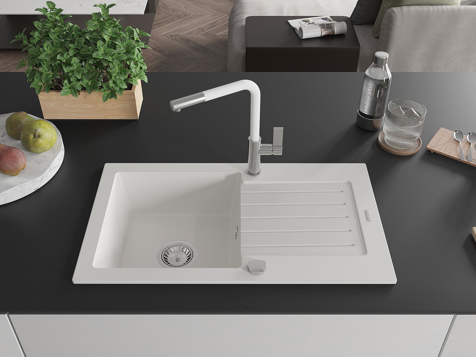 Mexen Pablo lavello da cucina in granito a 1 vasca con sgocciolatoio e miscelatore da cucina Flora, bianco - 6510-20-670401-02