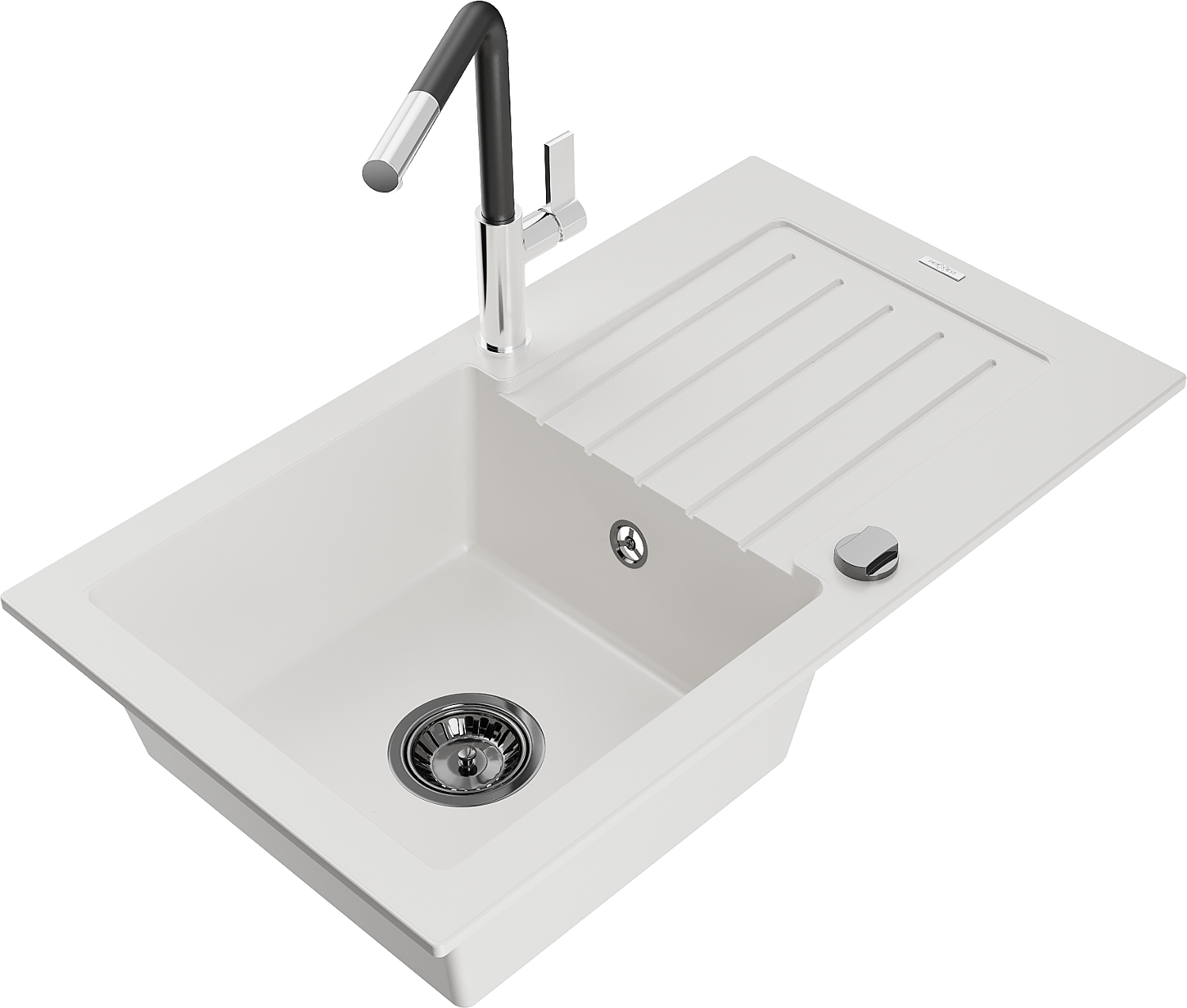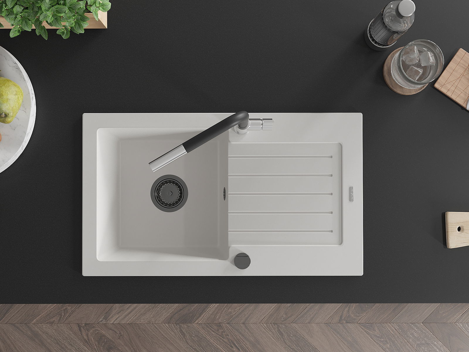 Mexen Pablo lavello in granito a 1 vasca con scolapiatti e miscelatore da cucina Flora, bianco - 6510-20-670401-07-B