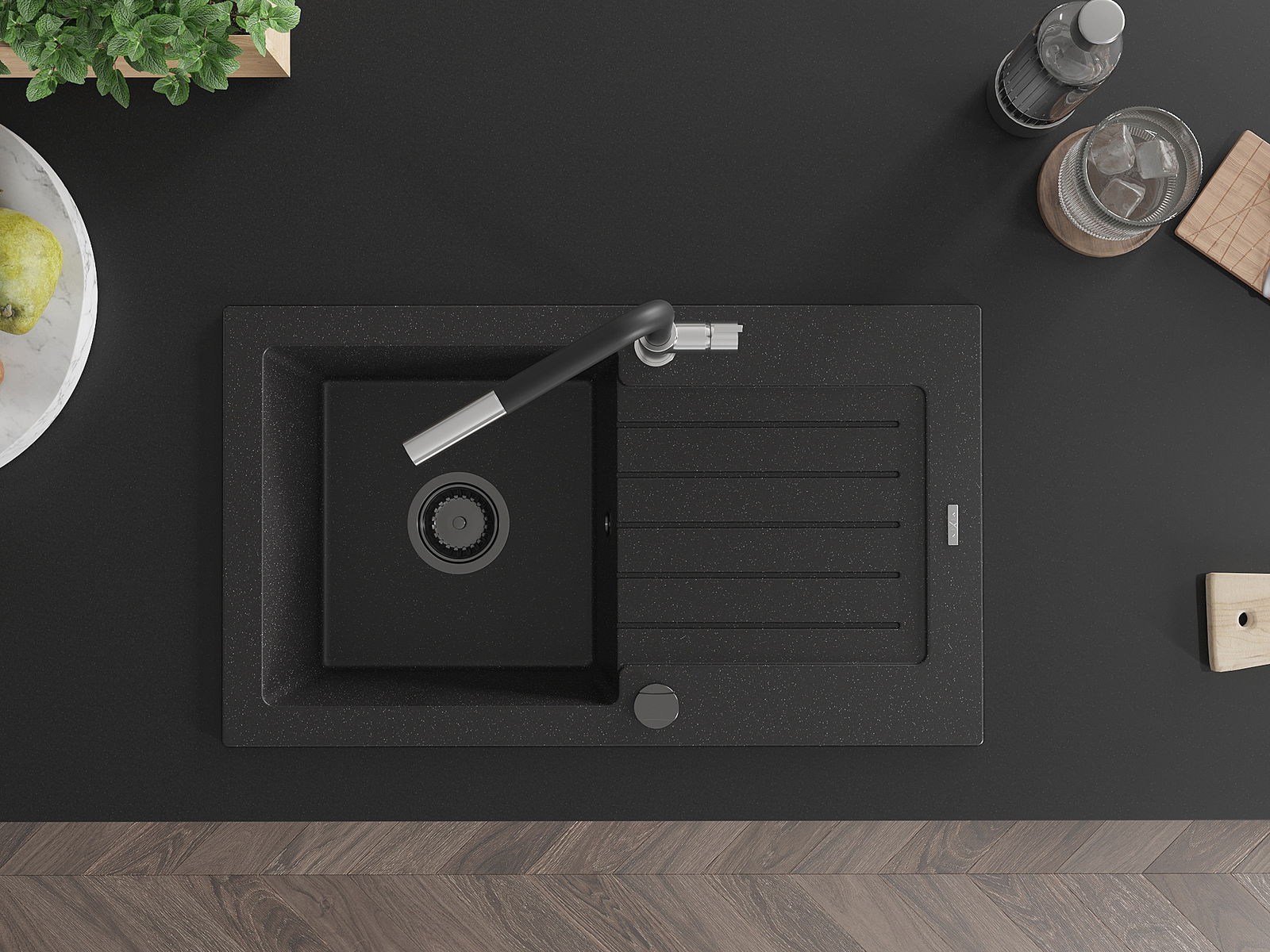 Mexen Pablo lavello in granito a 1 vasca con sgocciolatoio e rubinetto da cucina Flora, nero/argento metallizzato