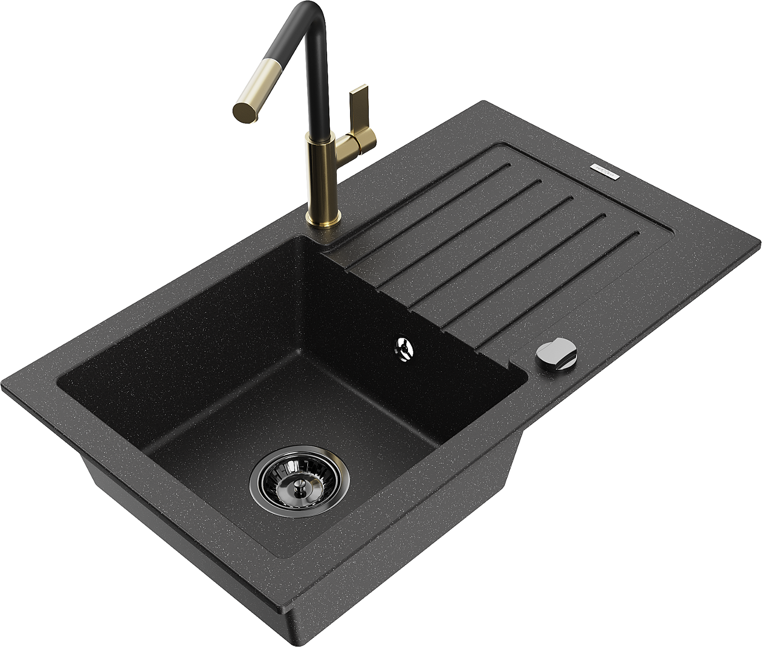 Mexen Pablo lavello in granito 1 vasca con scolapiatti e rubinetto da cucina Flora, nero/argento metallico - 6510-73-670401-57-B