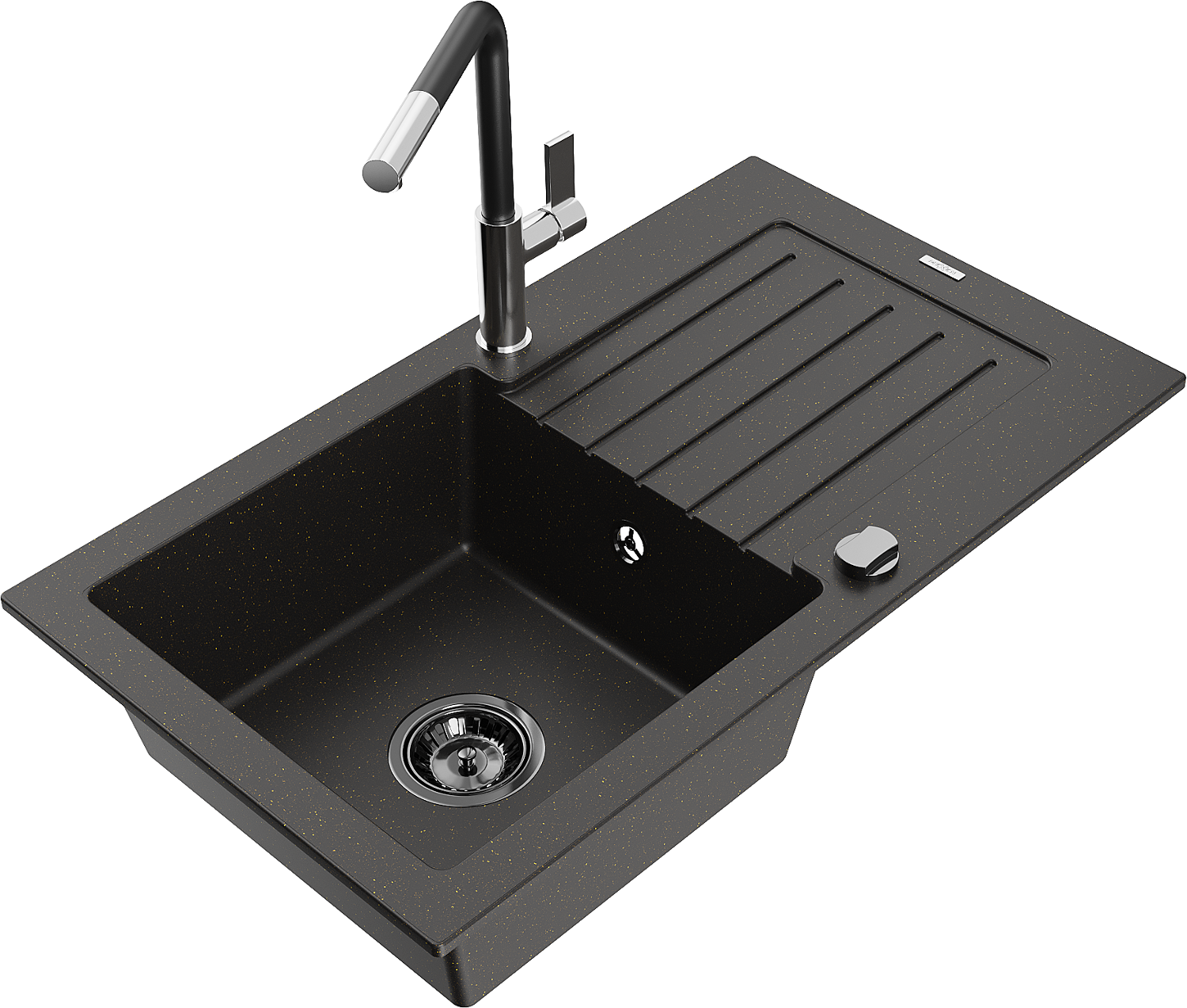 Mexen Pablo lavello in granito a 1 vasca con gocciolatoio e rubinetto da cucina Flora, nero/oro metallizzato