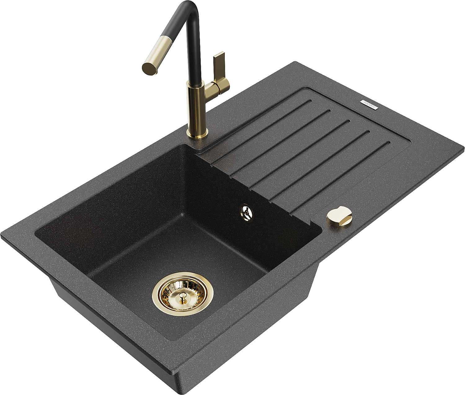 Mexen Pablo lavello in granito ad 1 vasca con scolapiatti e rubinetto da cucina Flora, nero maculato - 6510-76-670401-57-G