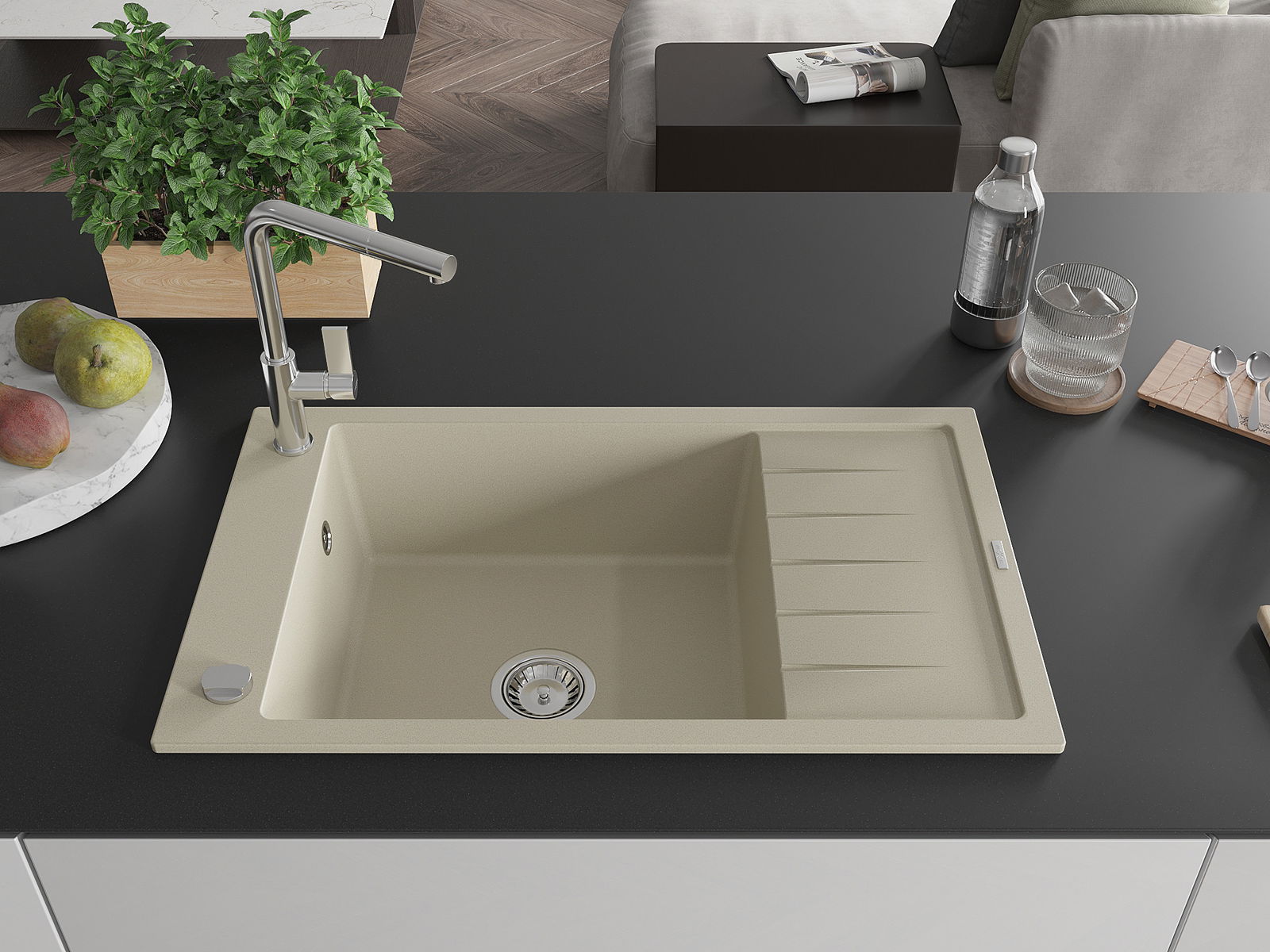 Il lavello è realizzato in granito di alta qualità. Rappresenta un complemento elegante e, soprattutto, pratico per ogni cucina, indipendentemente dal suo stile. L'alta qualità e la durata del granito garantiscono un utilizzo che dura per molti anni.