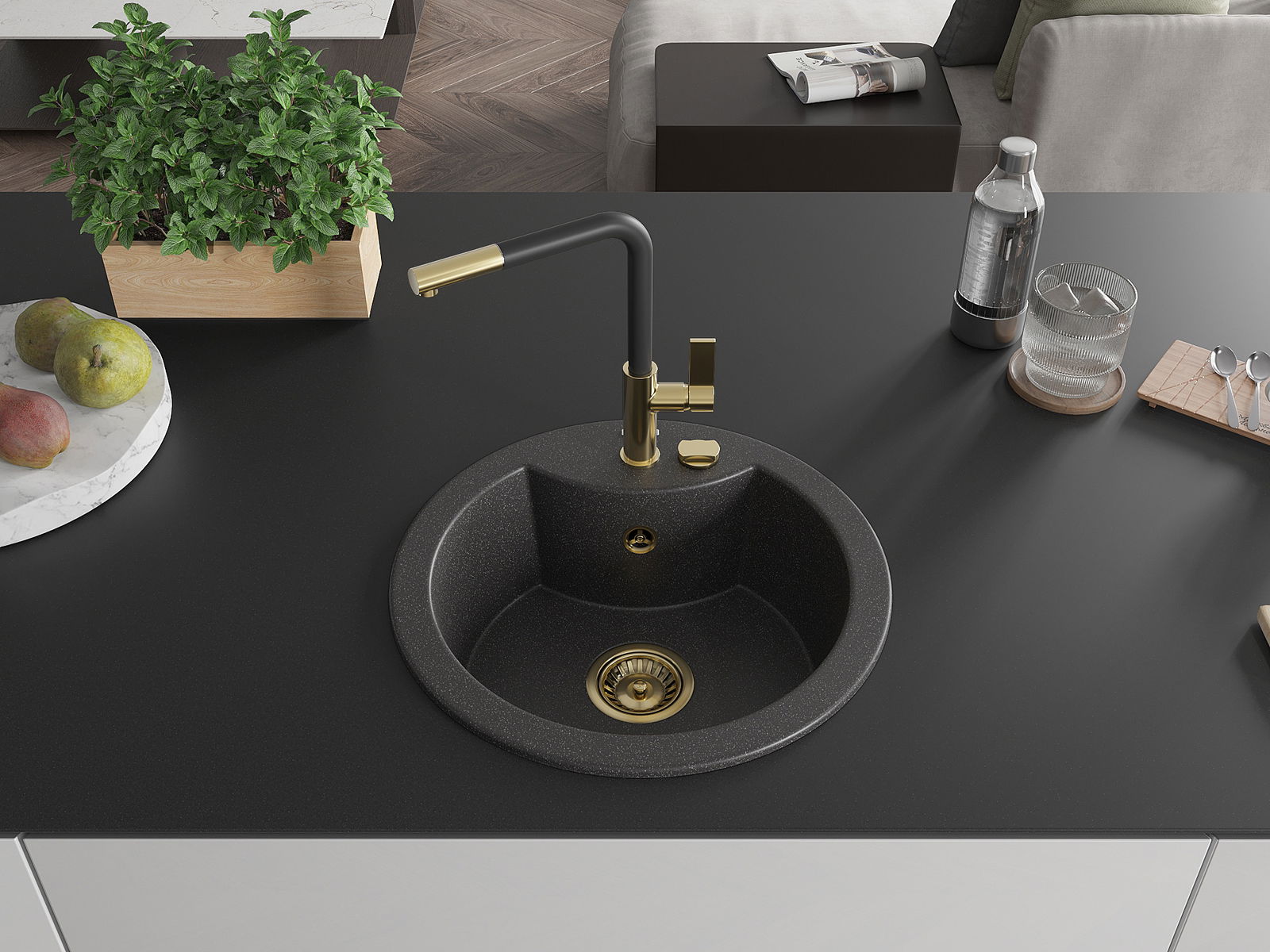 Mexen Diego lavello in granito 1-vasca con rubinetto da cucina Flora, nero maculato - 6512-76-670401-57-G