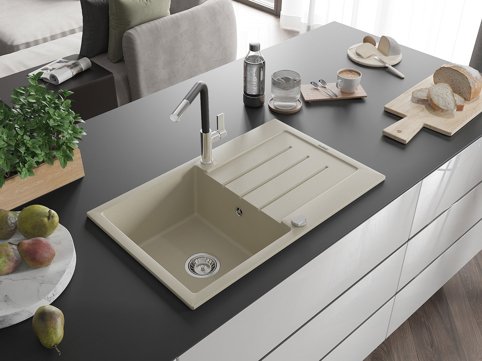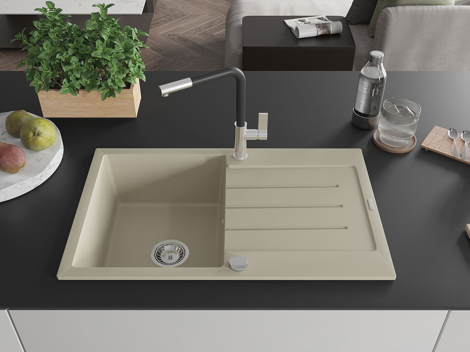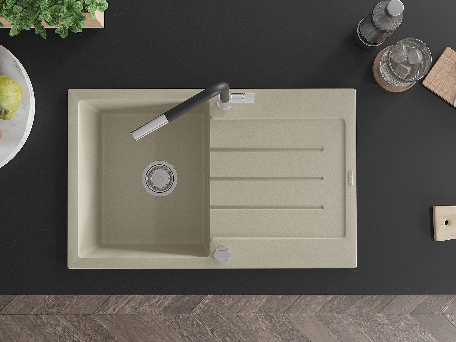 Il lavello è realizzato in granito di alta qualità. Rappresenta un complemento elegante e, soprattutto, pratico per ogni cucina, indipendentemente dal suo stile. L'alta qualità e la durata del granito garantiscono un utilizzo che dura per molti anni.