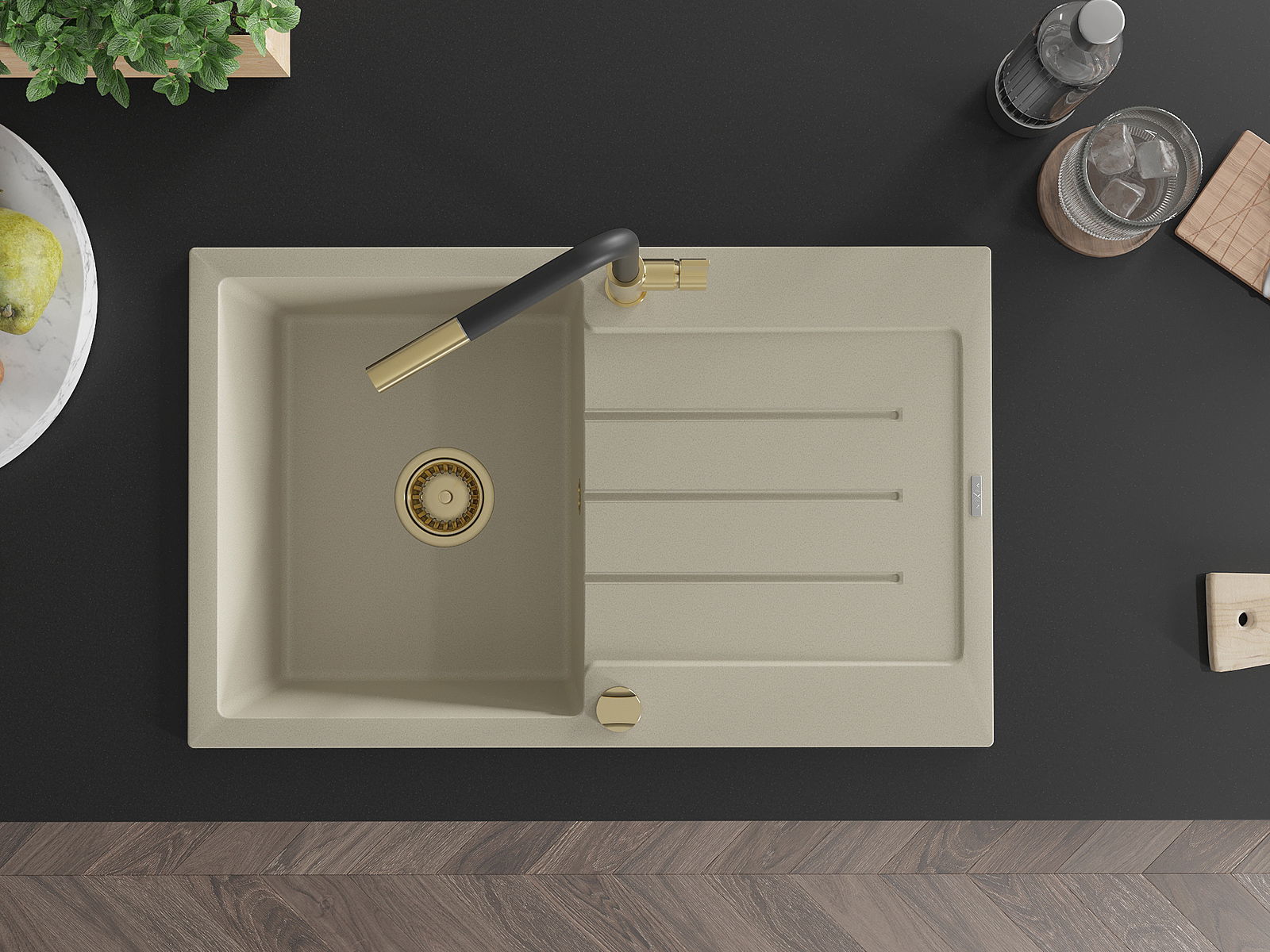 Mexen Bruno lavello in granito 1-vasca con sgocciolatoio e rubinetto da cucina Flora, beige - 6513-69-670401-57-G