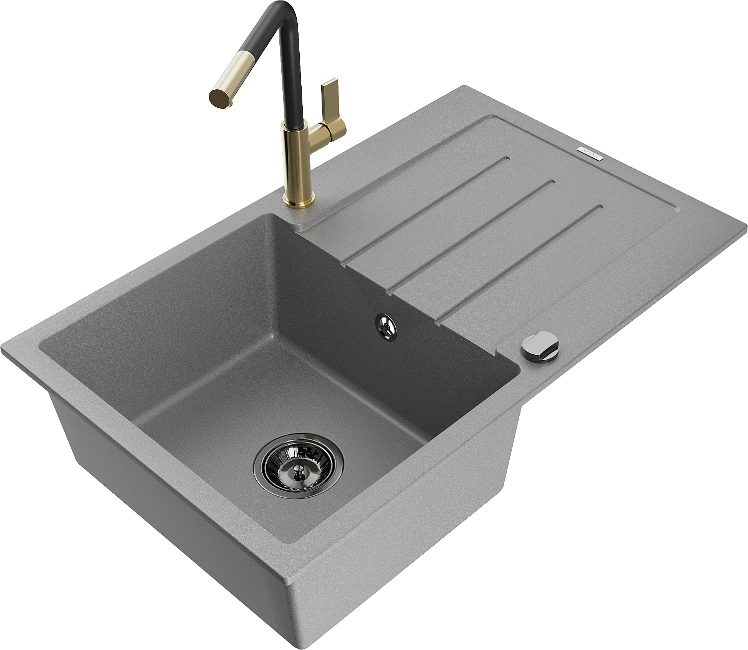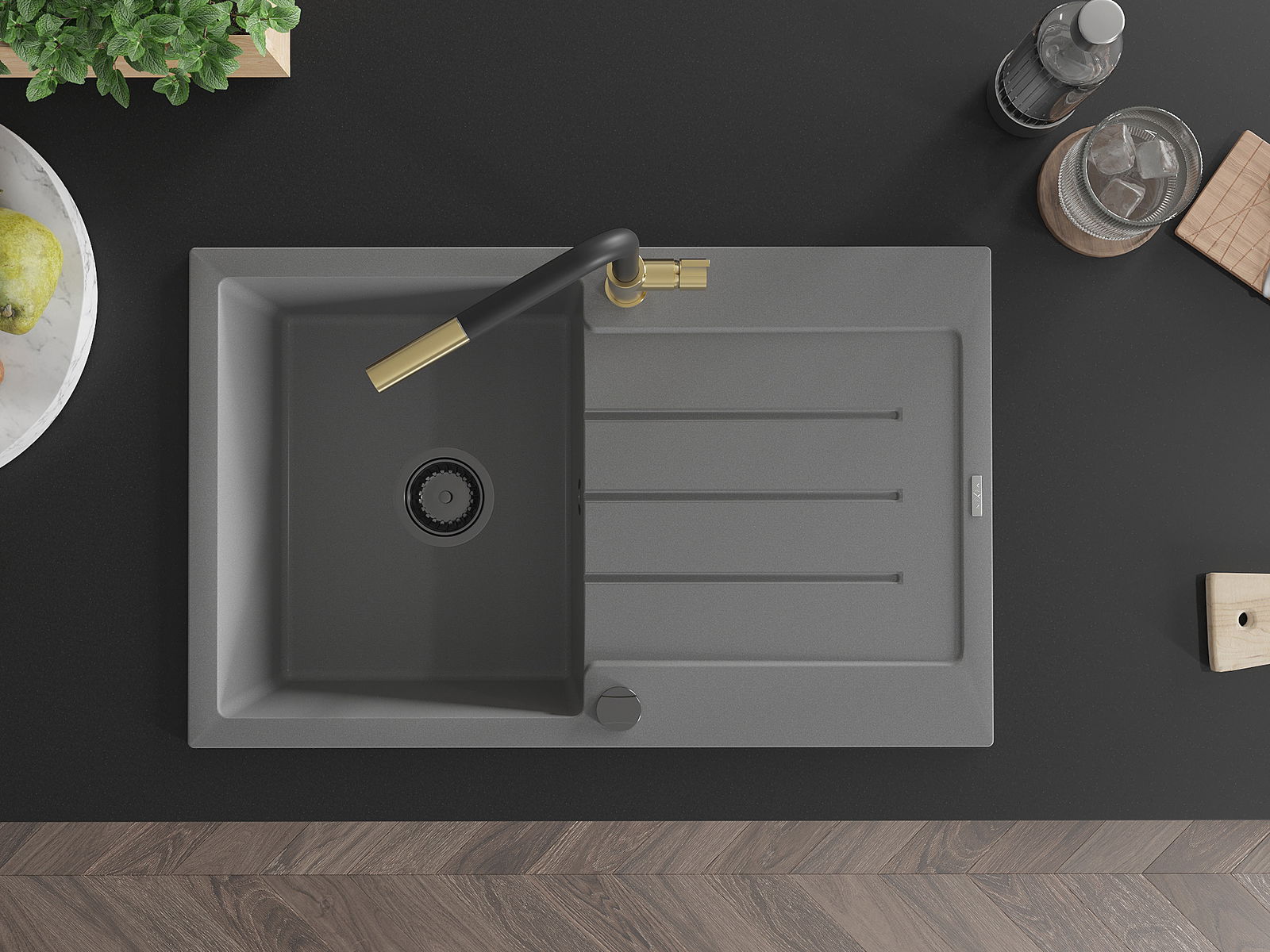 Mexen Bruno lavello in granito 1-vasca con scolapiatti e rubinetto da cucina Flora, grigio - 6513-71-670401-57-B