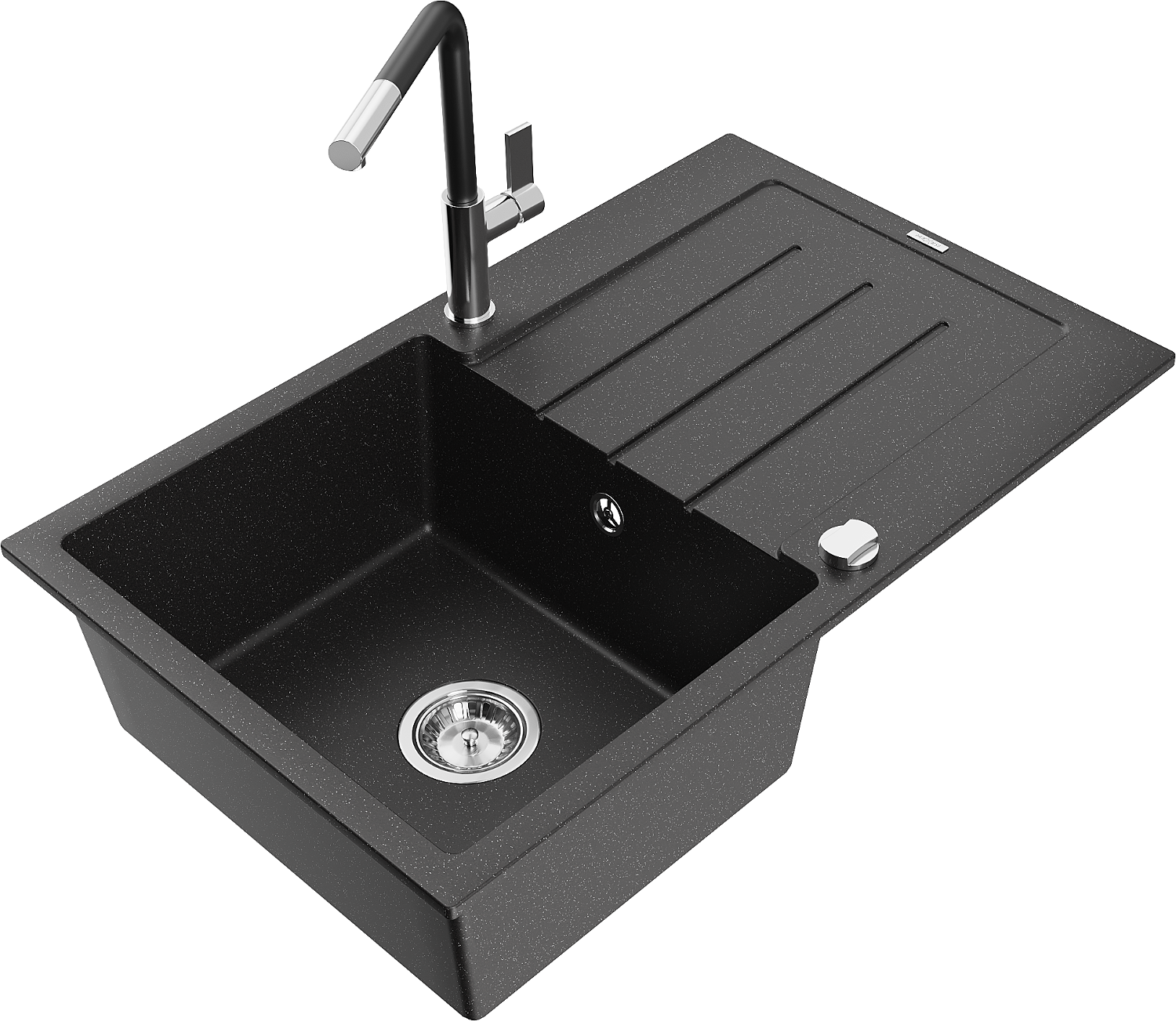 Mexen Bruno lavello in granito a 1 vasca con sgocciolatoio e rubinetto da cucina Flora, nero/metallo argentato