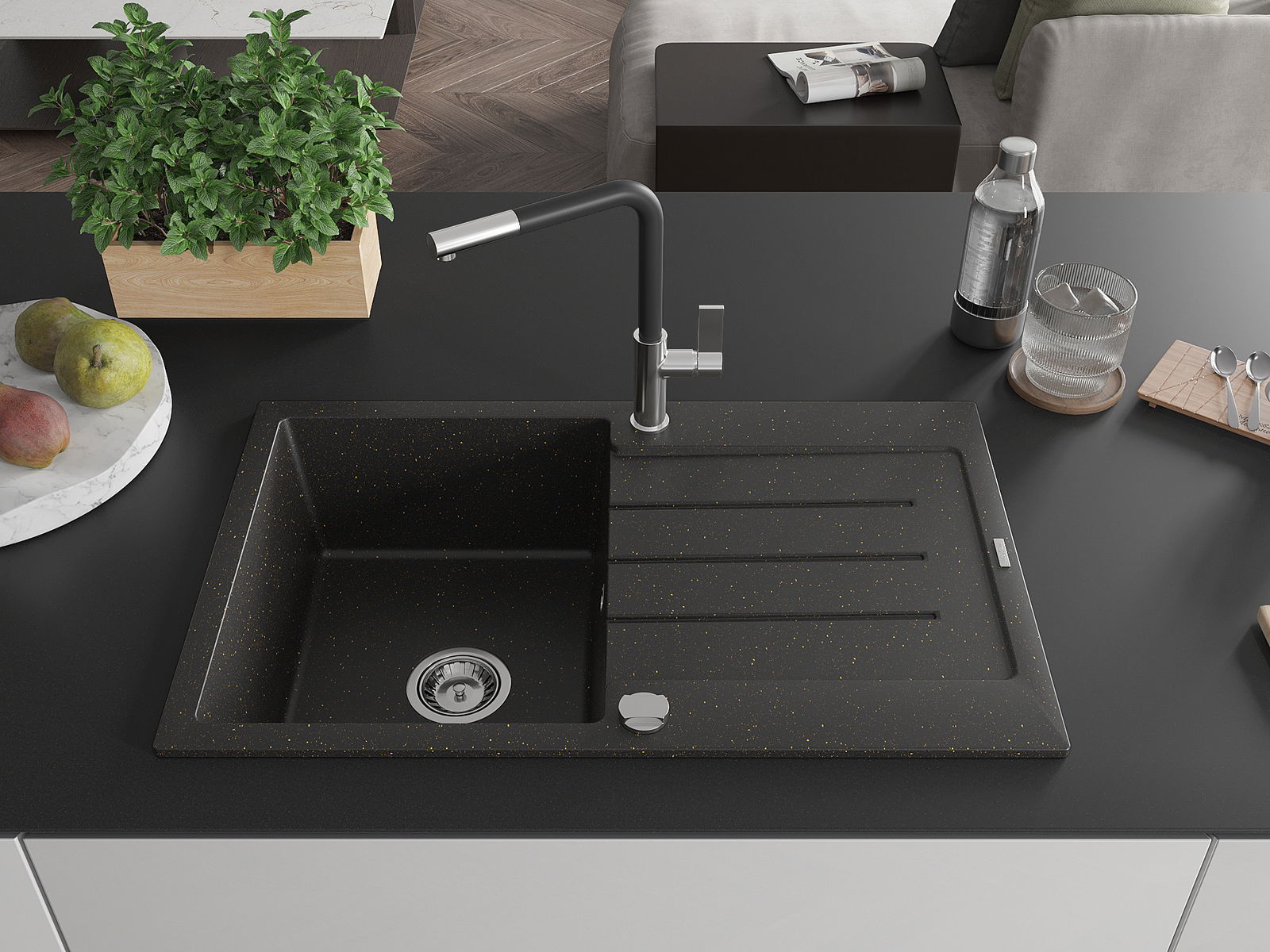 Mexen Bruno lavello in granito a 1 vasca con sgocciolatoio e rubinetto da cucina Flora, nero/oro metallizzato