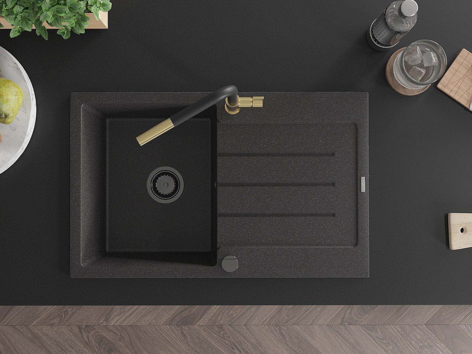 Mexen Bruno lavello in granito a 1 vasca con sgocciolatoio e miscelatore da cucina Flora, nero puntinato - 6513-76-670401-57-B