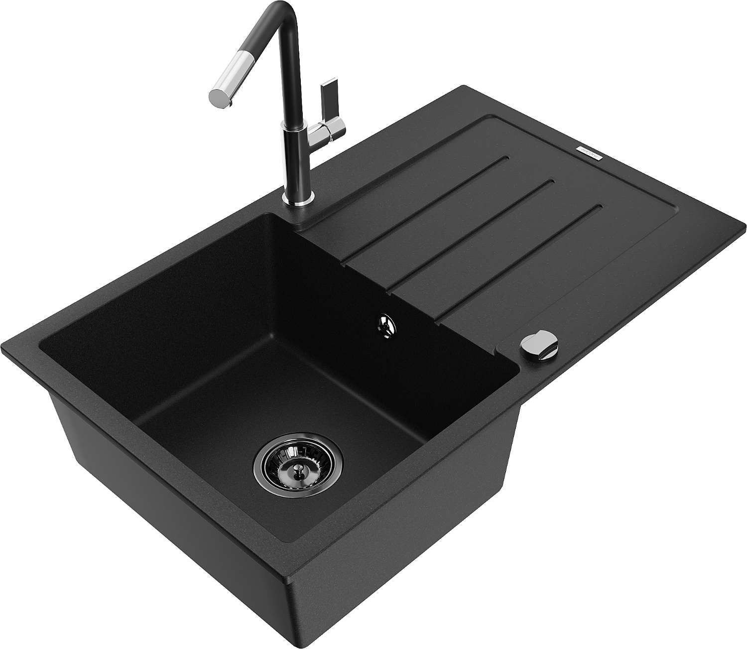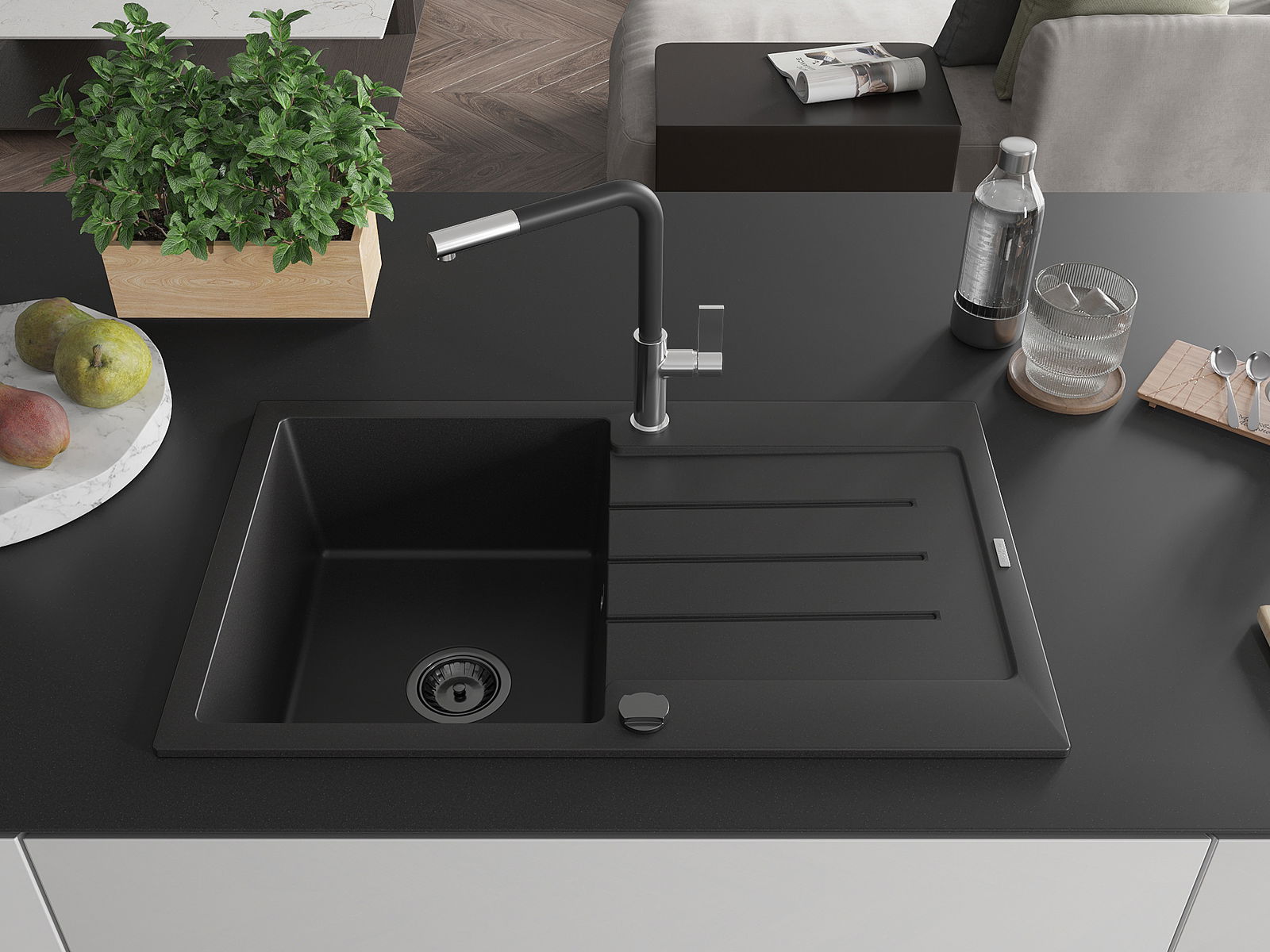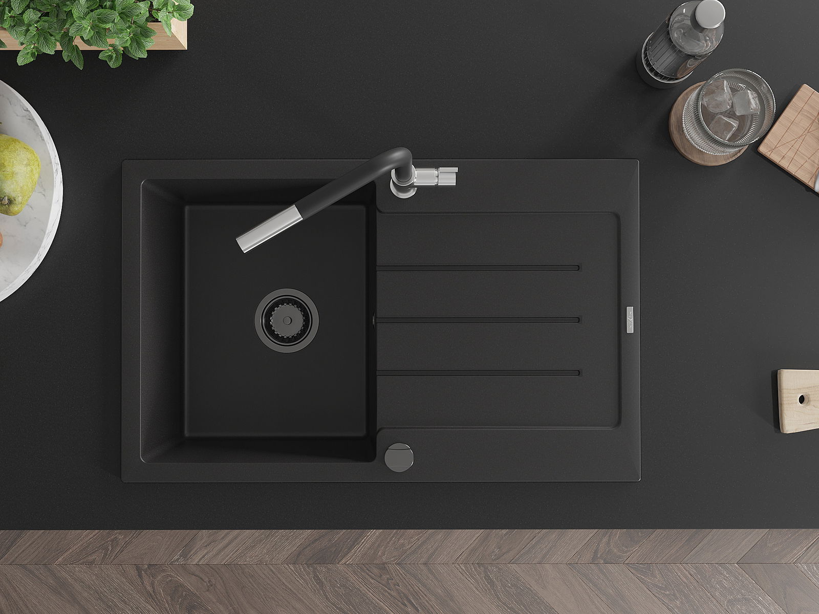 Mexen Bruno lavello in granito 1 vasca con gocciolatoio e rubinetto da cucina Flora, nero - 6513-77-670401-07-B