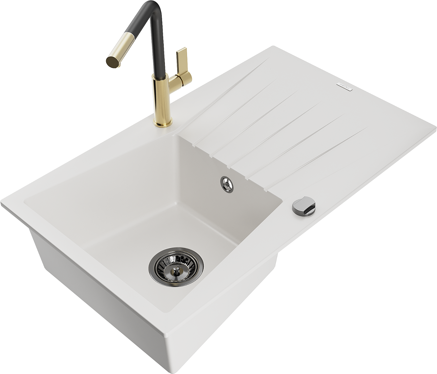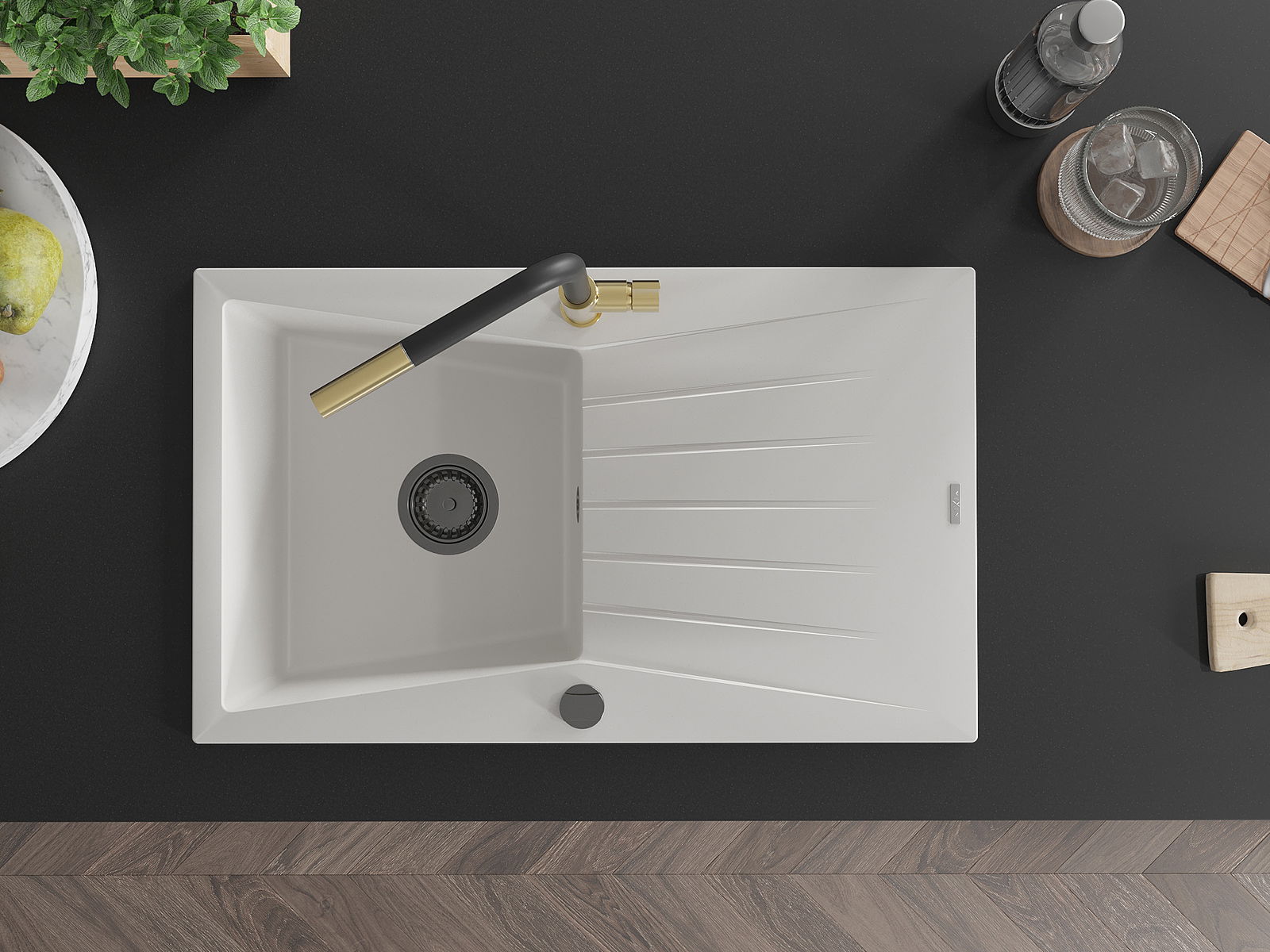 Mexen Cesar lavello da cucina in granito a 1 vasca con scolapiatti e miscelatore da cucina Flora, bianco - 6514-20-670401-57-B