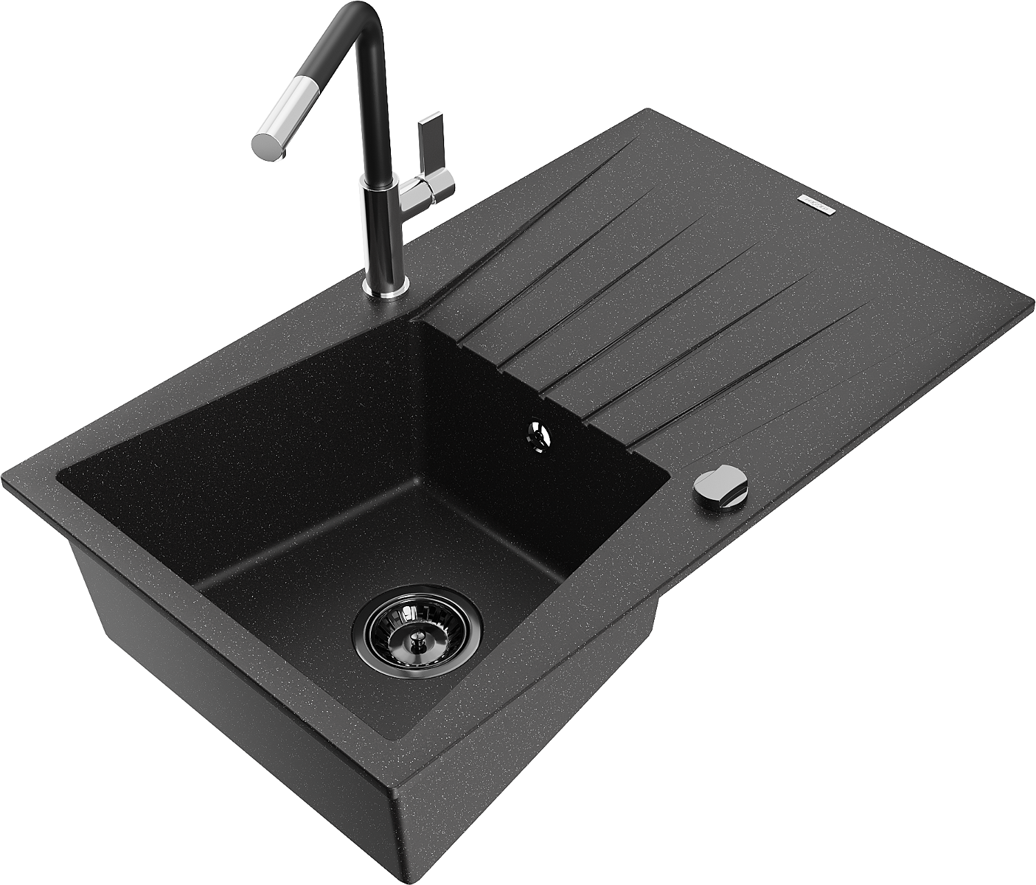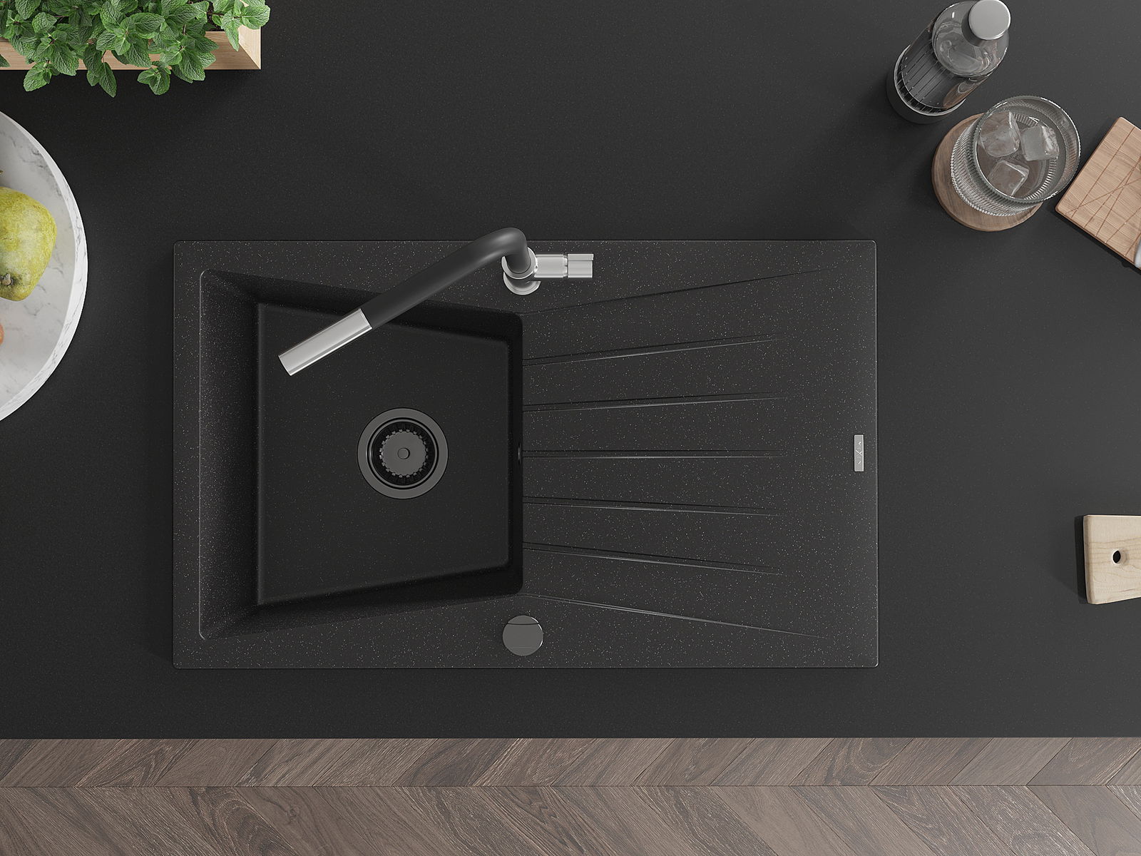 Mexen Cesar lavello in granito a 1 vasca con gocciolatoio e rubinetto da cucina Flora, nero/argento metallizzato