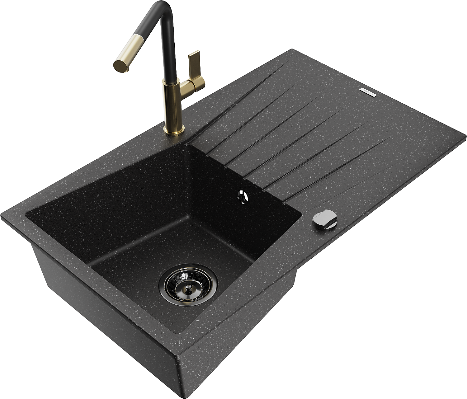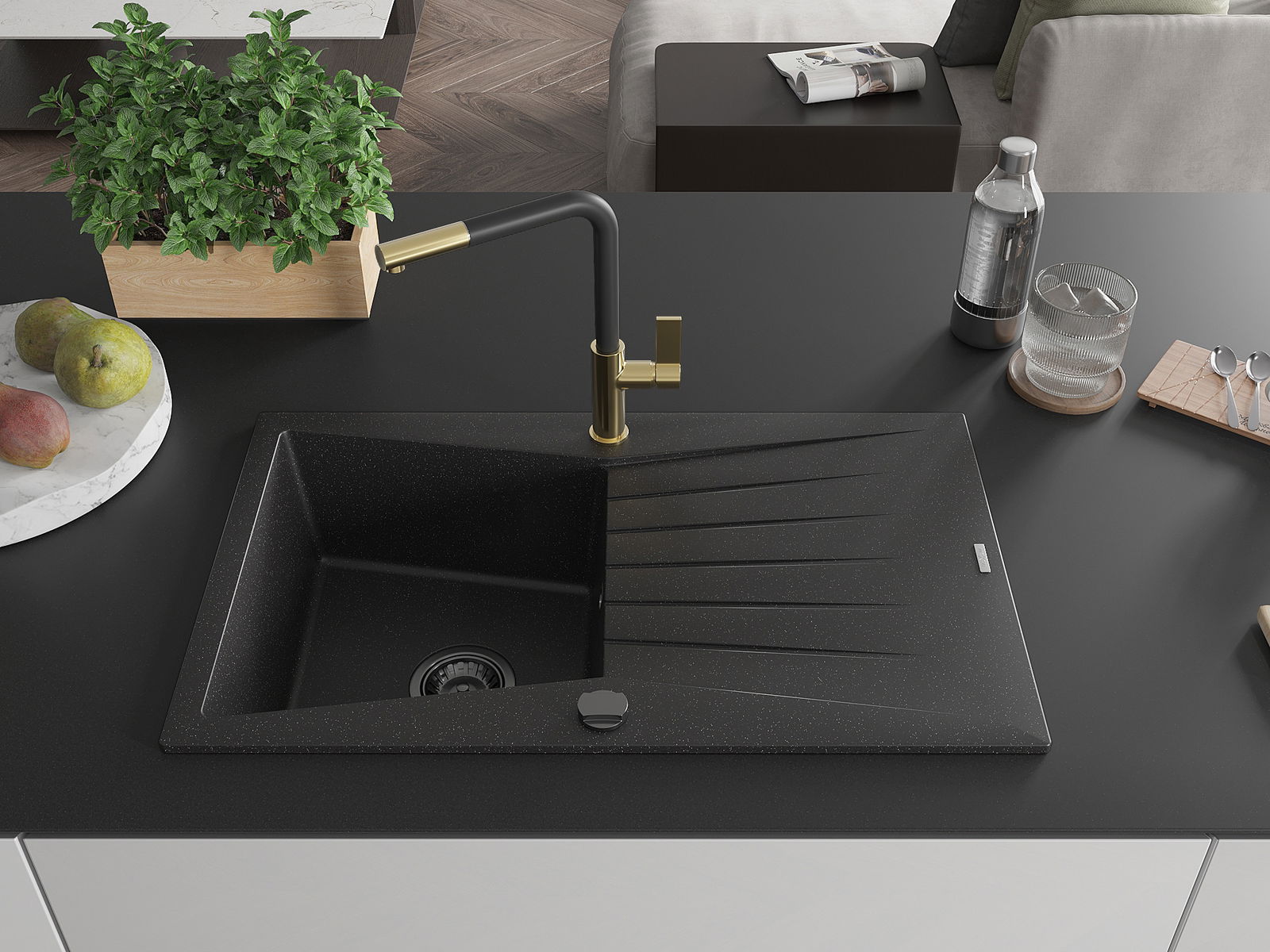 Mexen Cesar lavello in granito a 1 vasca con sgocciolatoio e rubinetto da cucina Flora, nero/argento metallizzato