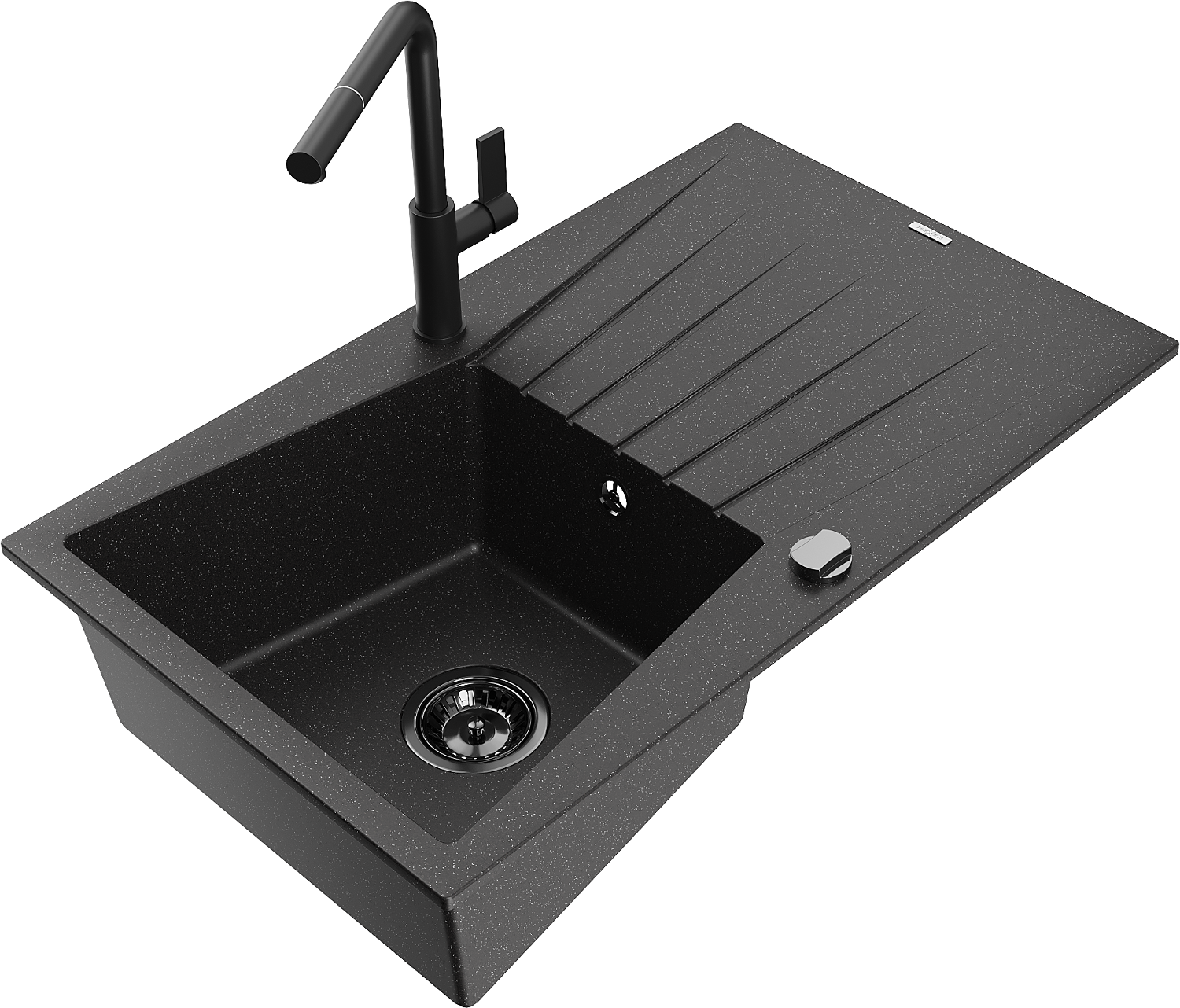 Mexen Cesar lavello in granito a 1 vasca con sgocciolatoio e rubinetto da cucina Flora, nero/argento metallizzato