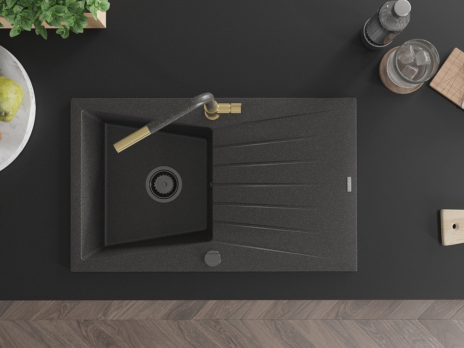 Mexen Cesar lavello in granito a 1 vasca con scolapiatti e rubinetto da cucina Flora, nero maculato - 6514-76-670401-75-B