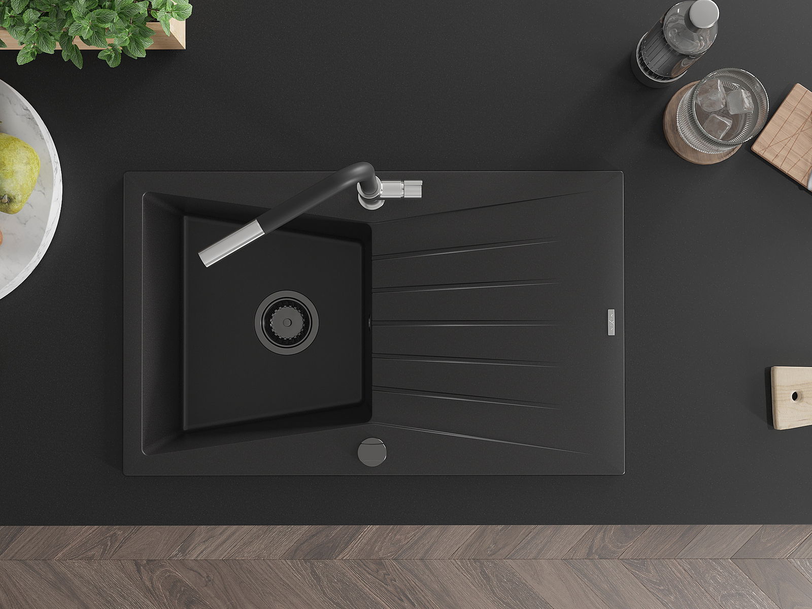 Mexen Cesar lavello in granito a 1 vasca con gocciolatoio e miscelatore cucina Flora, nero - 6514-77-670401-07-B