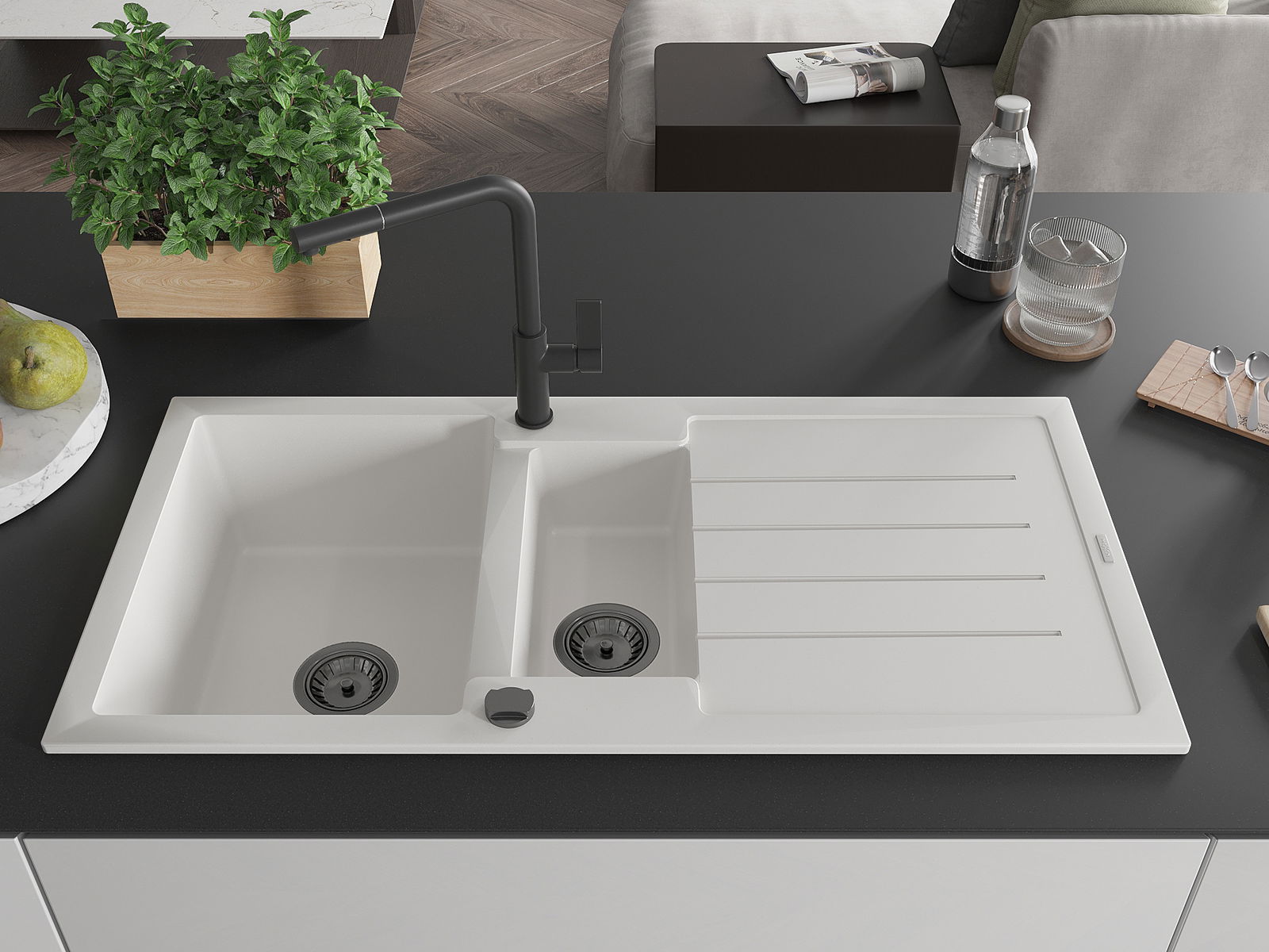 Mexen Andres lavello in granito da 1,5 vasche con scolapiatti e rubinetto da cucina Flora, bianco - 6515-20-670401-70-B