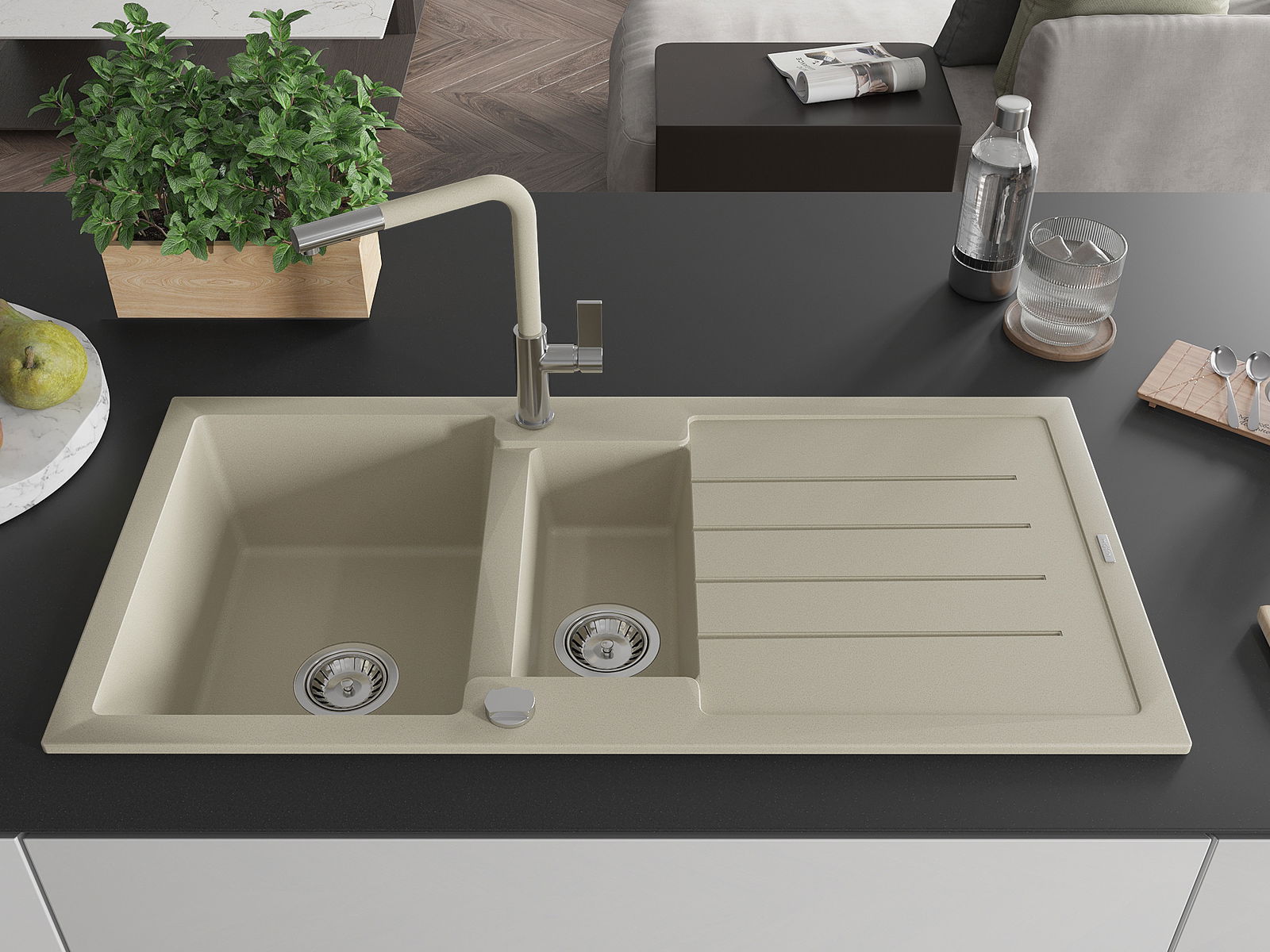 Il lavello è realizzato in granito di alta qualità. Rappresenta un complemento elegante e, soprattutto, pratico per ogni cucina, indipendentemente dal suo stile. L'alta qualità e la durata del granito garantiscono un utilizzo che dura per molti anni.