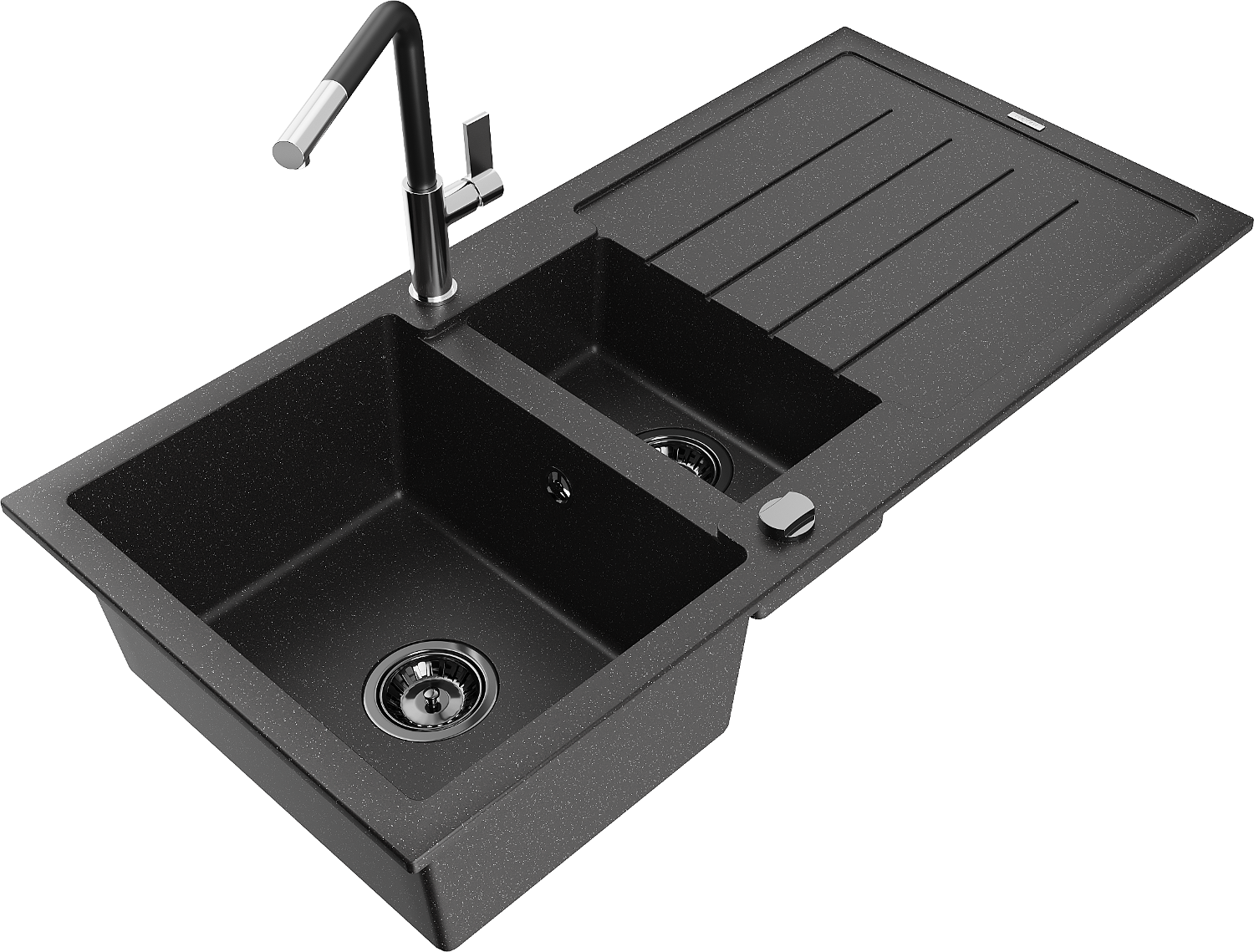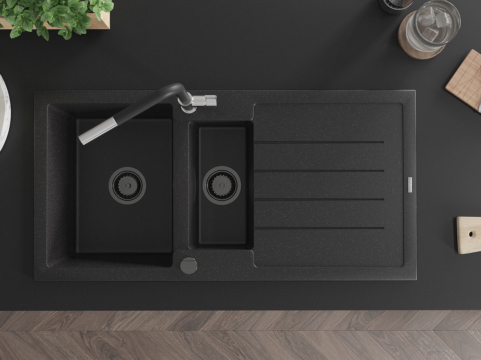 Mexen Andres lavello in granito 1,5 vasche con sgocciolatoio e rubinetto da cucina Flora, nero/argento - 6515-73-670401-07-B