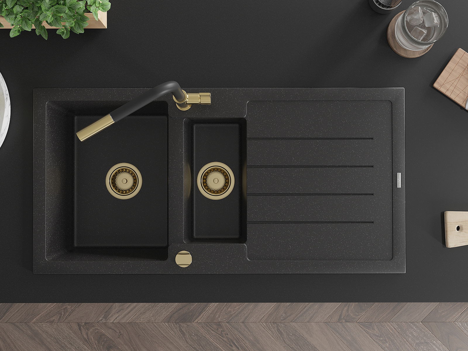 Mexen Andres lavello in granito 1,5 vasche con scolapiatti e rubinetto da cucina Flora, nero/argento - 6515-73-670401-57-G