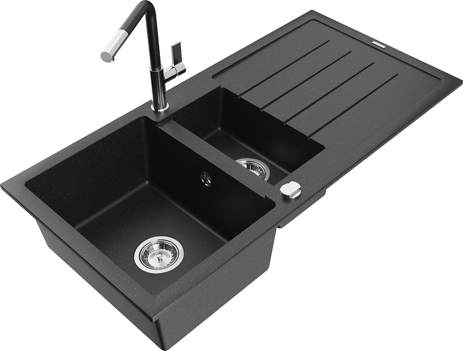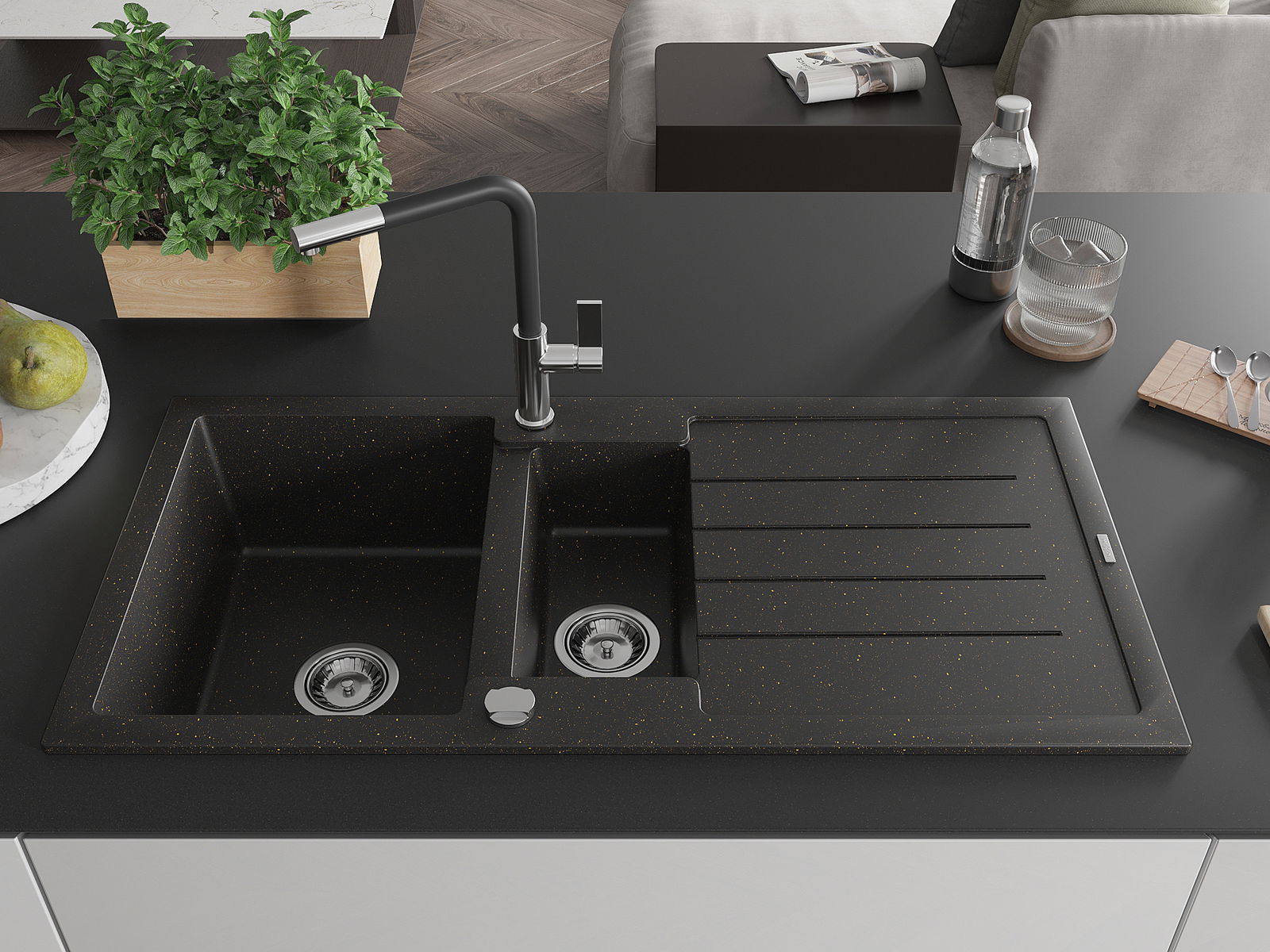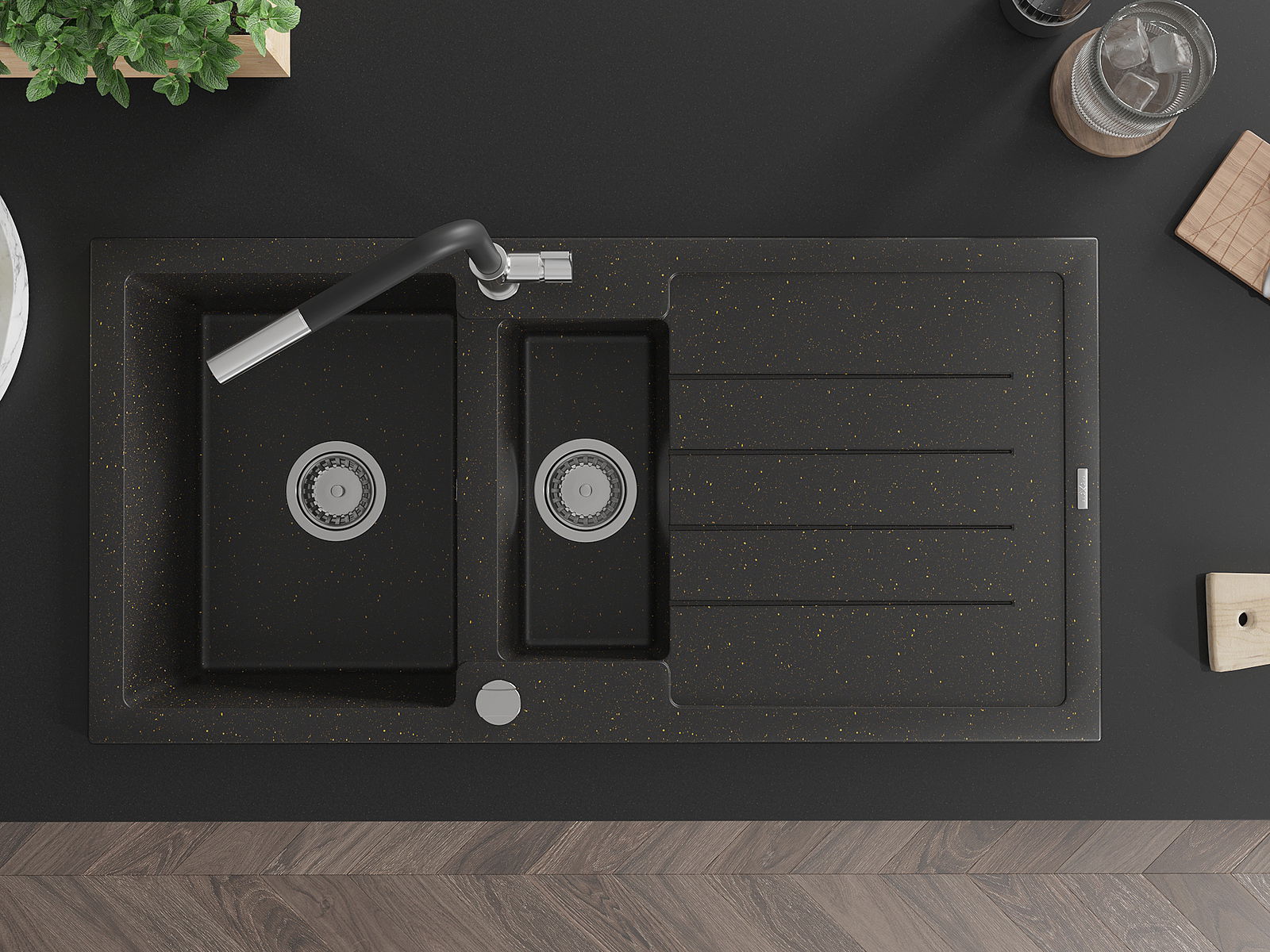Mexen Andres lavello in granito a 1,5 vasche con scolapiatti e rubinetto da cucina Flora, nero/oro metallizzato