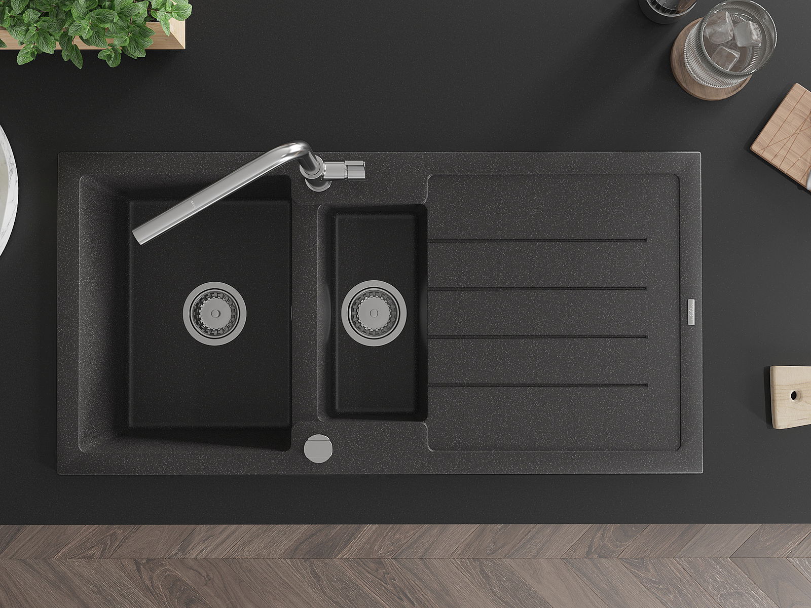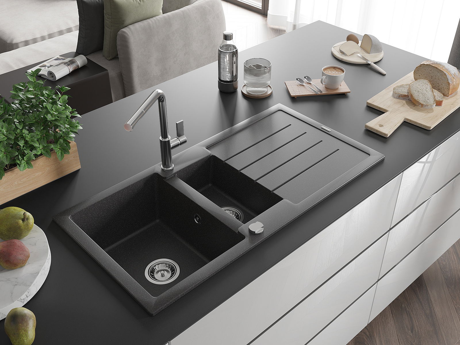La scelta di un lavello con sgocciolatoio è una soluzione pratica che consente di riporre piatti, verdure e frutta lavati. Lo sgocciolatoio facilita la cucina quotidiana e aiuta a mantenere l'ordine in cucina.