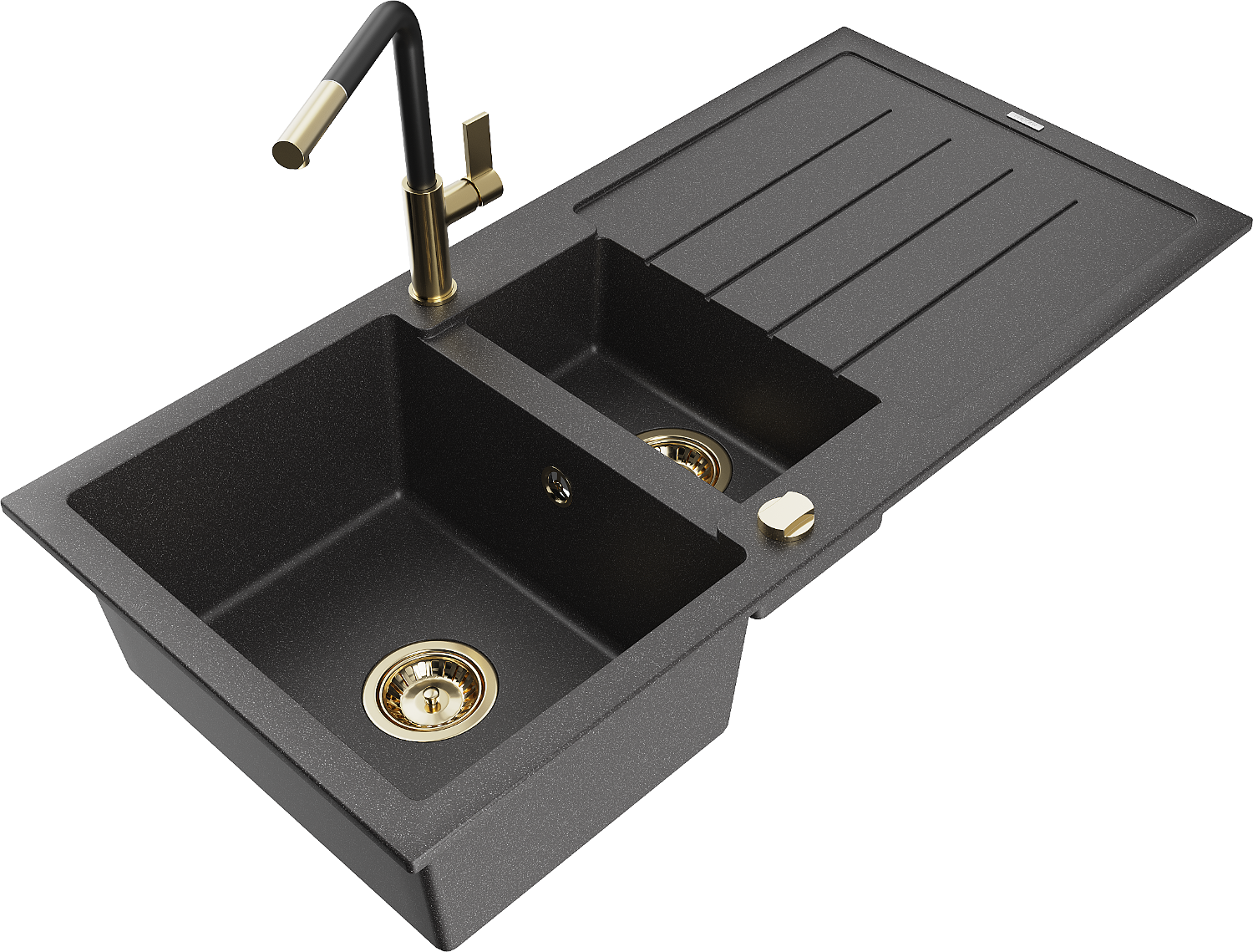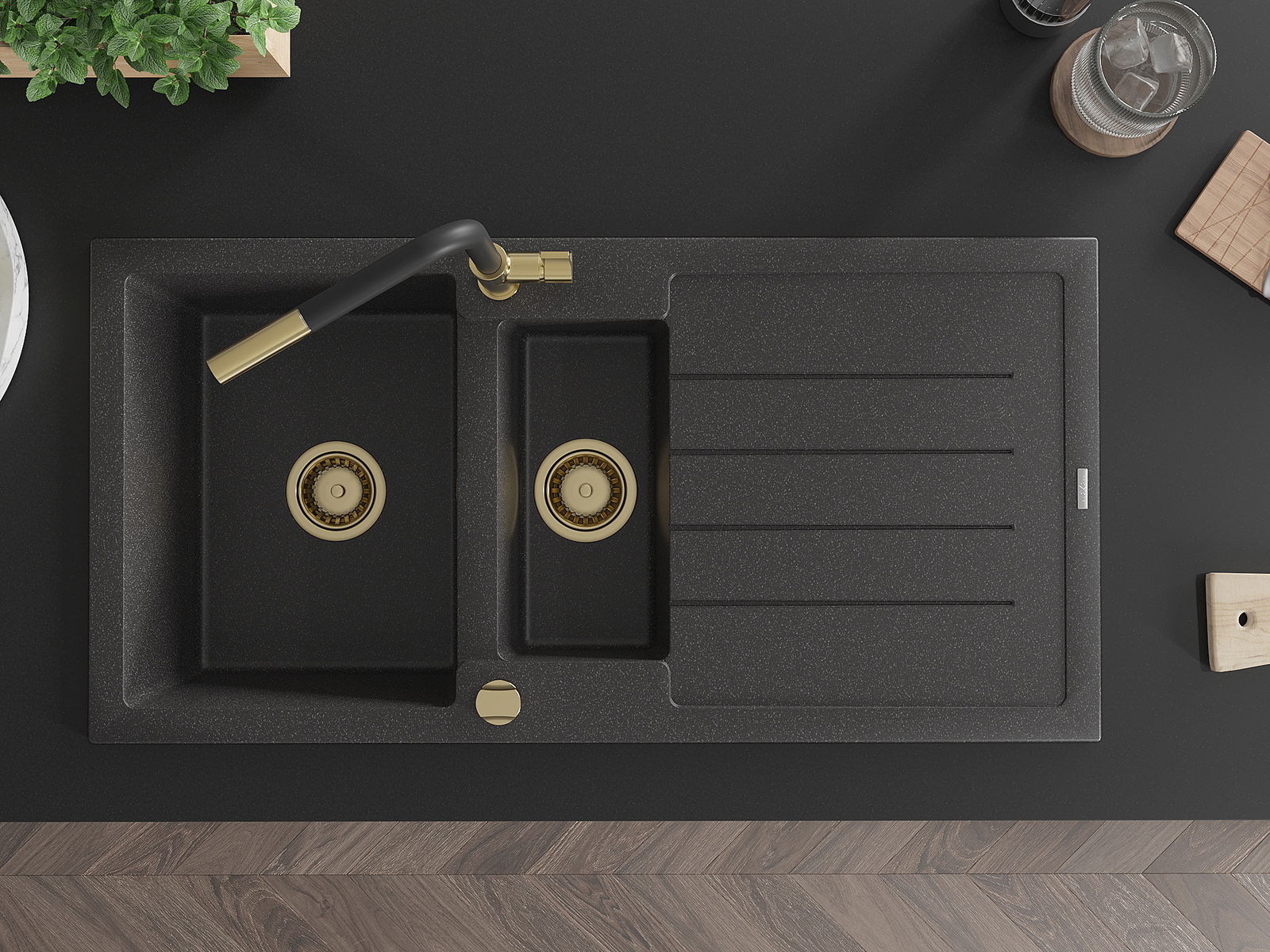 Mexen Andres lavello da cucina in granito con 1,5 vasche con scolapiatti e rubinetto Flora, nero maculato - 6515-76-670401-57-G