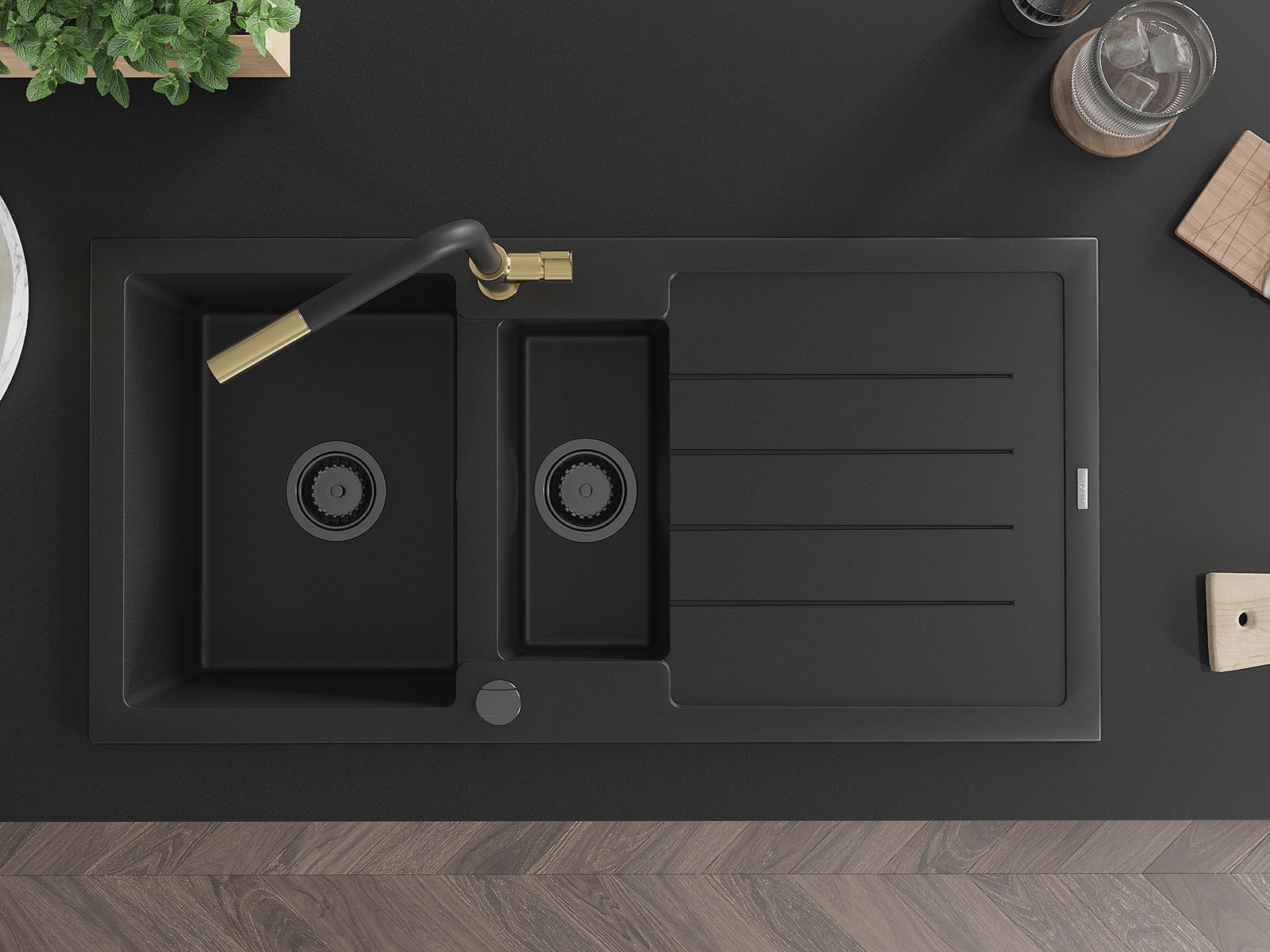 Mexen Andres lavello in granito 1,5 vasca con sgocciolatoio e rubinetto cucina Flora, nero - 6515-77-670401-57-B