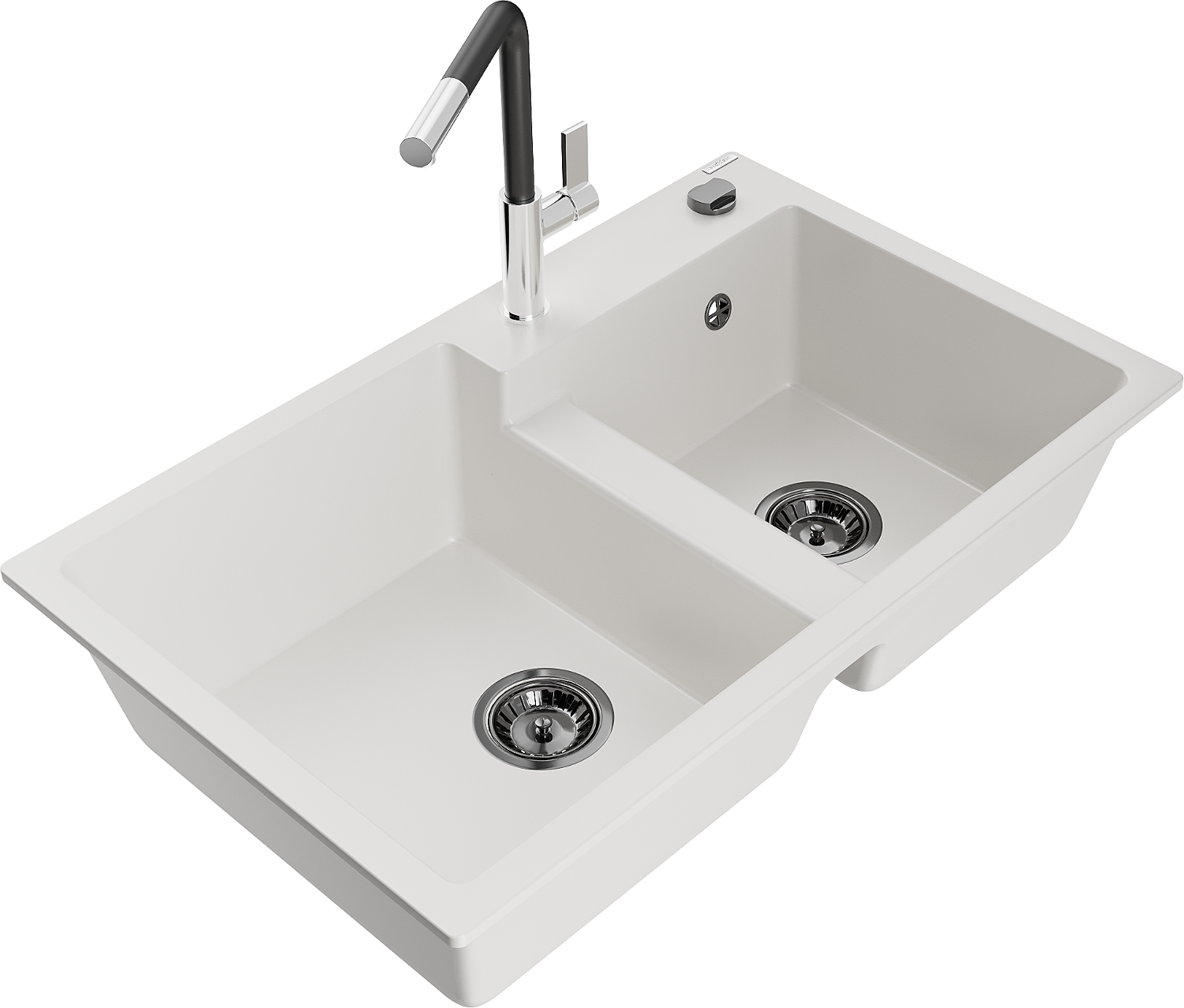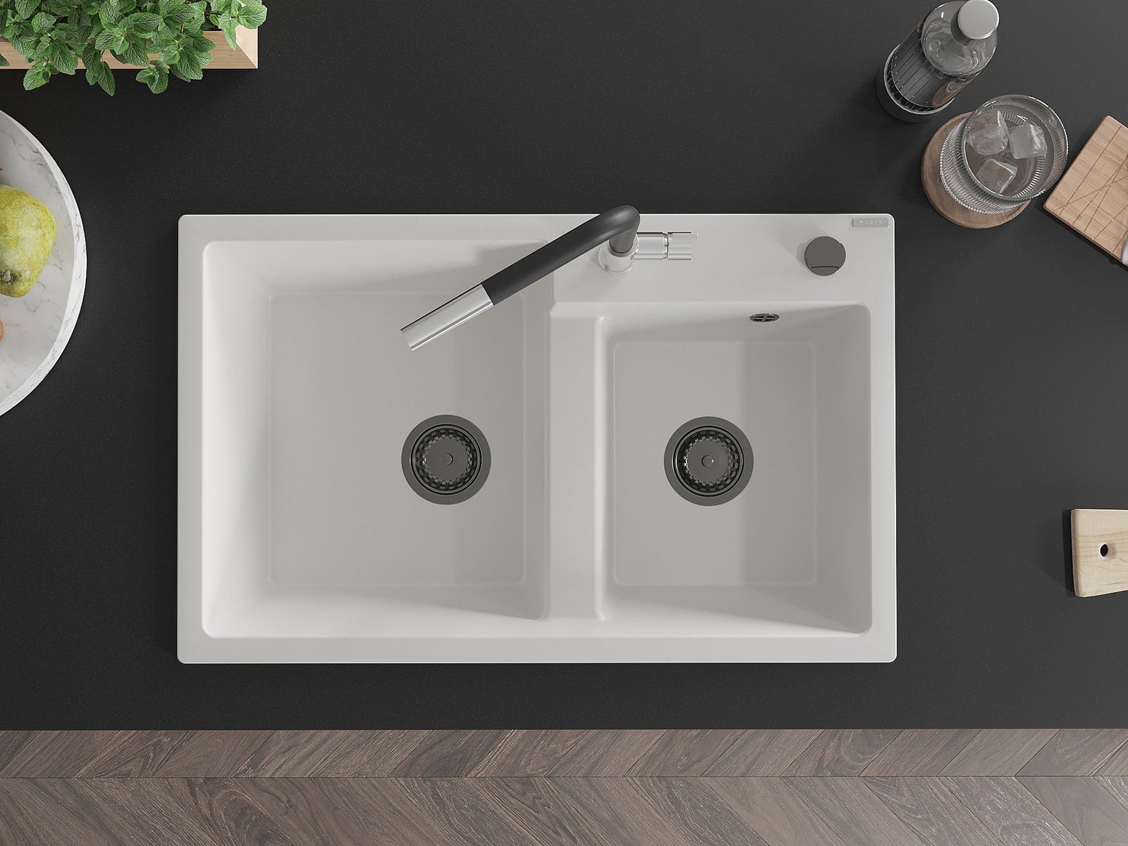 Mexen Tomas lavello da cucina in granito a 2 scomparti con miscelatore Flora, bianco - 6516-20-670401-07-B