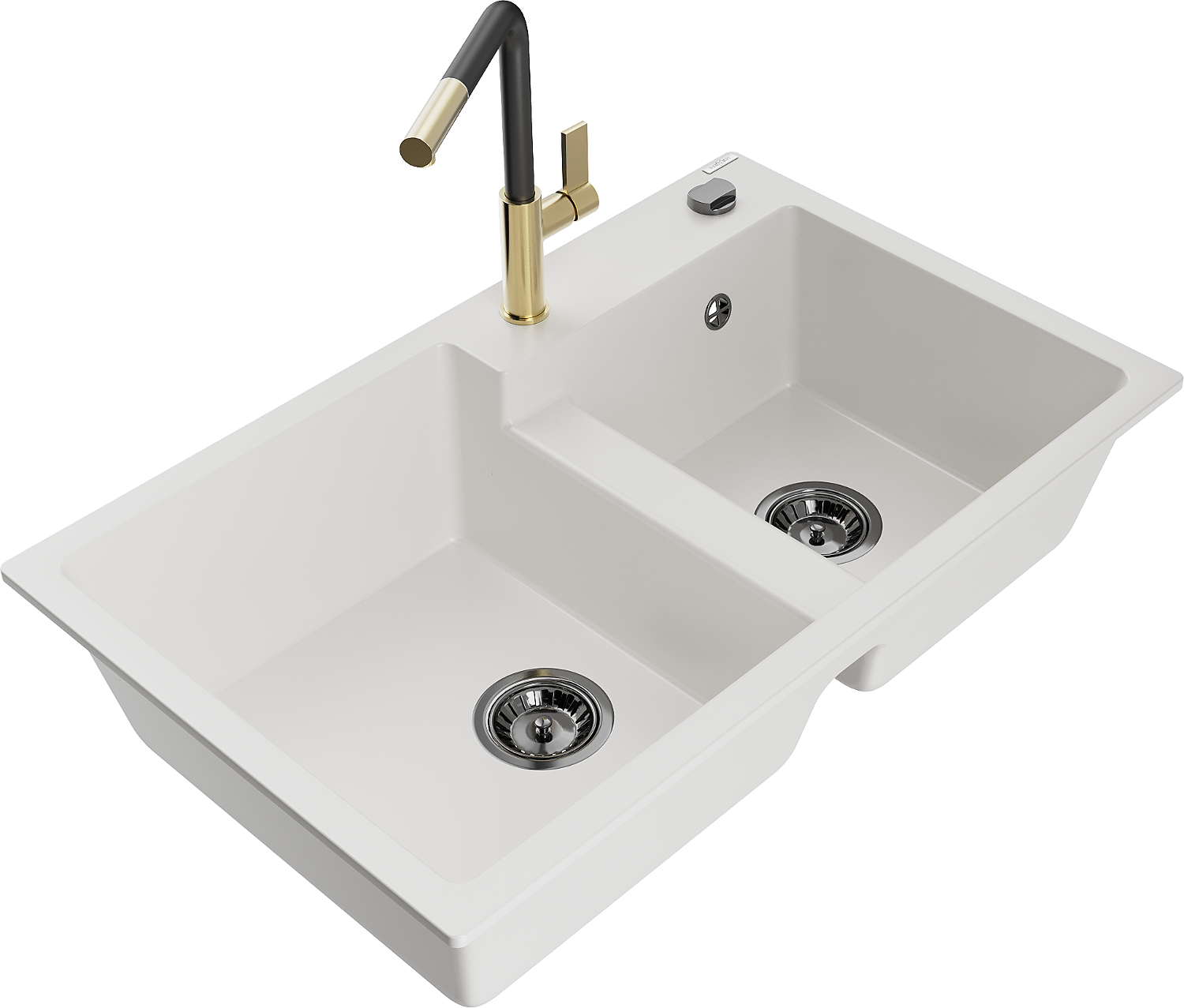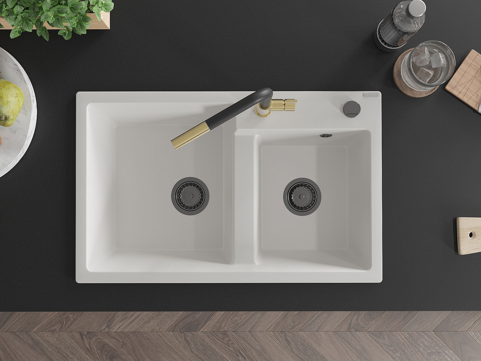 Mexen Tomas lavello da cucina in granito a 2 vasche con rubinetto da cucina Flora, bianco - 6516-20-670401-57-B