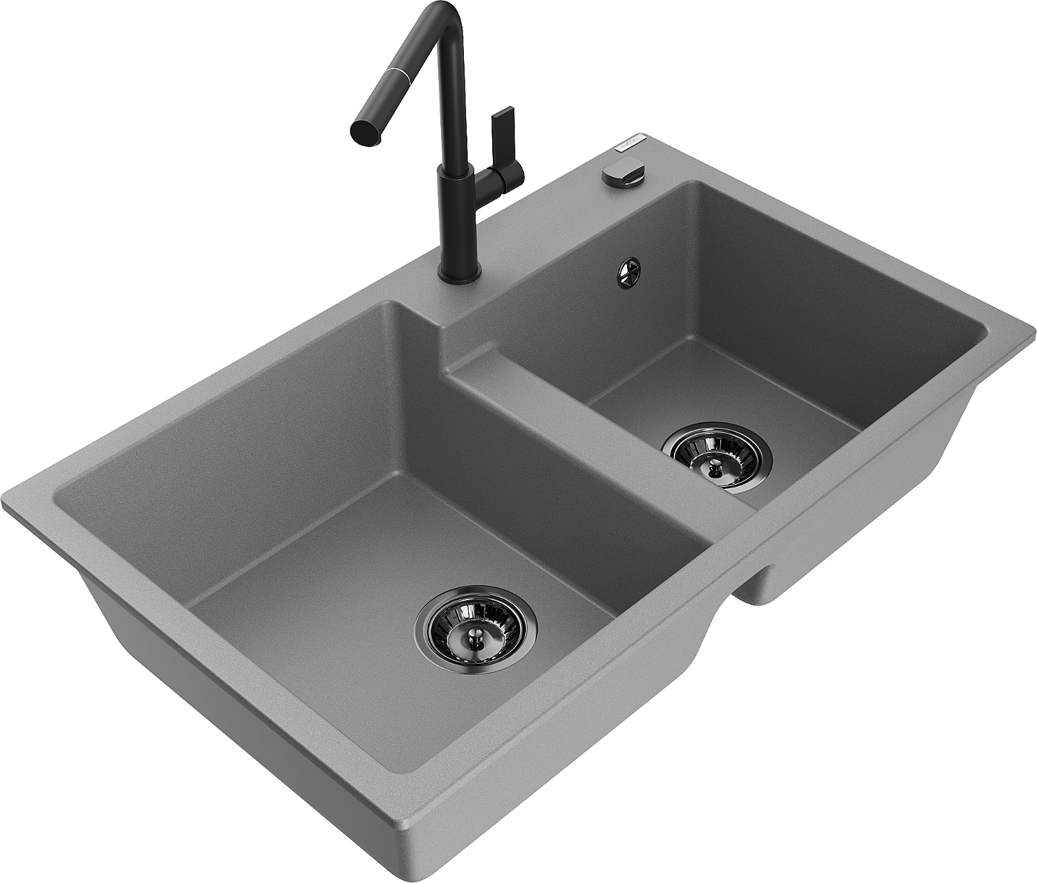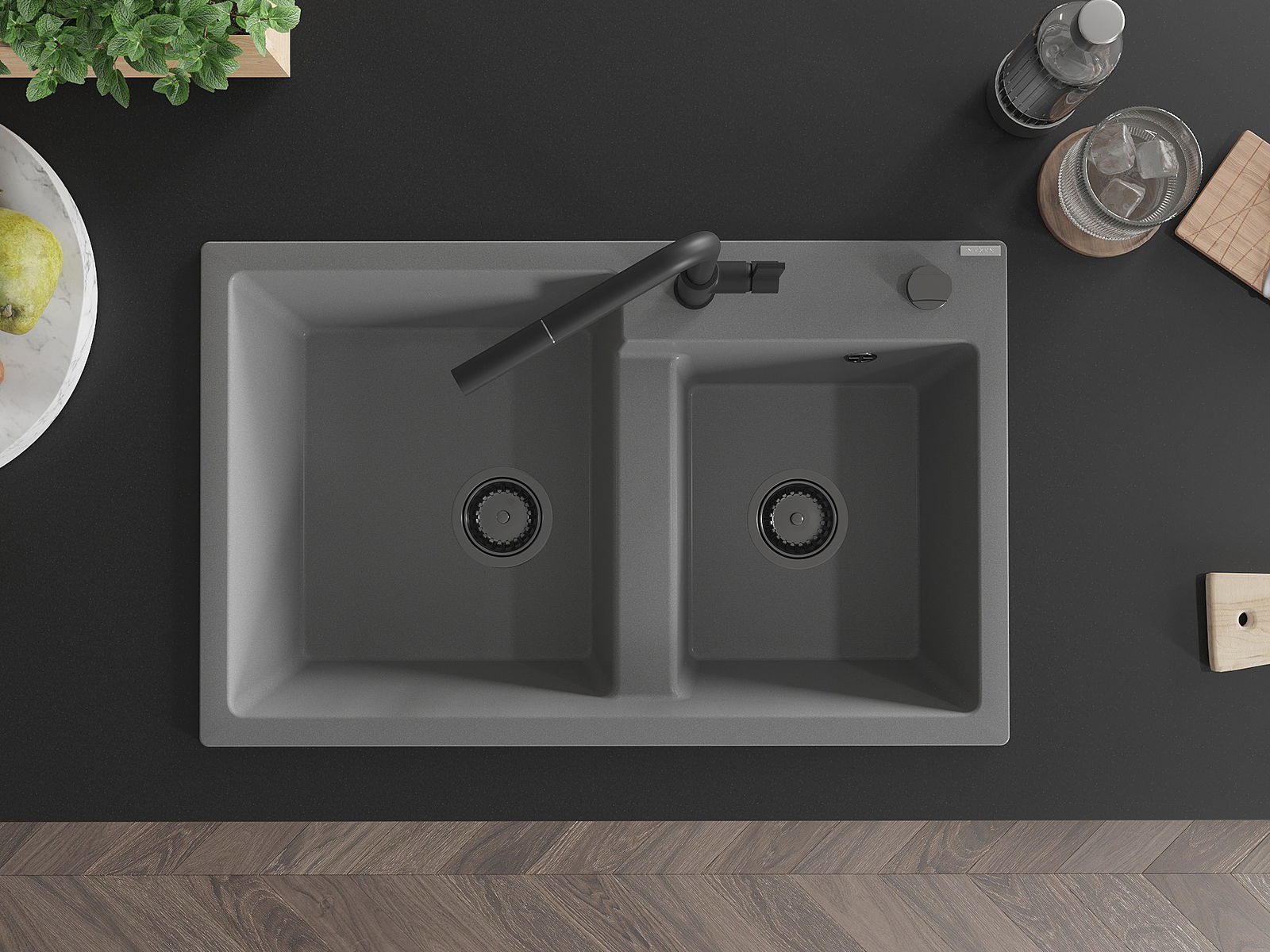 Mexen Tomas lavello da cucina in granito a 2 vasche con rubinetto Flora, grigio - 6516-71-670401-70-B