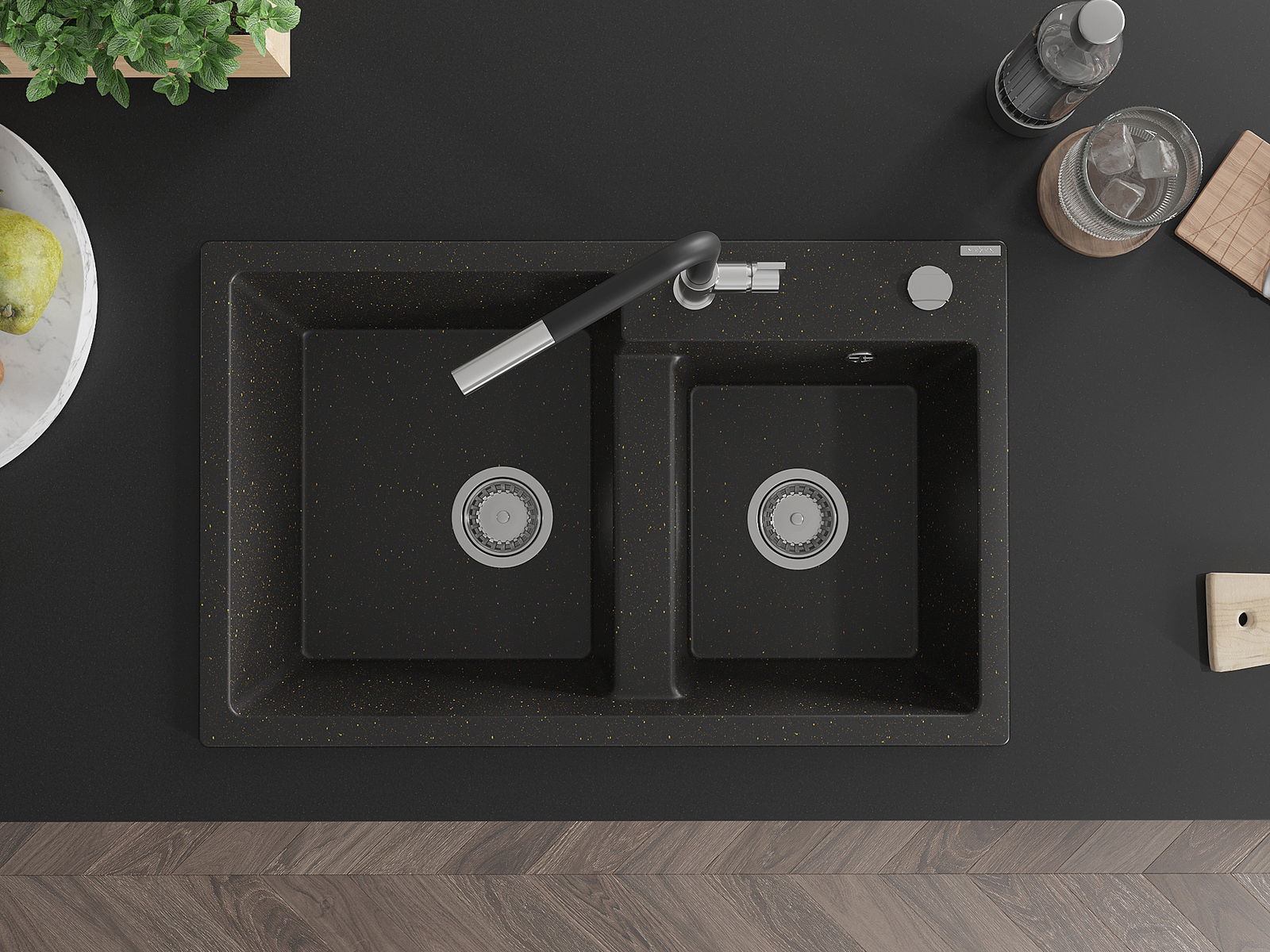 Mexen Tomas lavello in granito a 2 vasche con rubinetto da cucina Flora, nero/oro metallico - 6516-75-670401-07