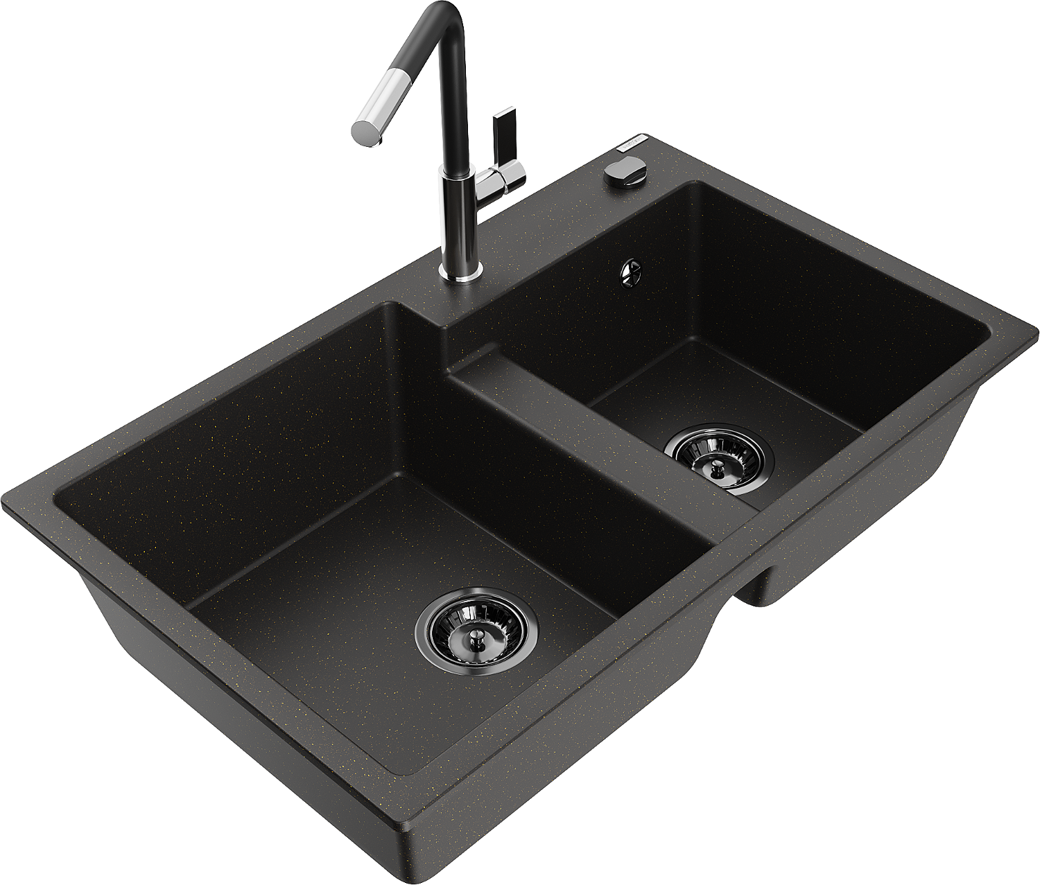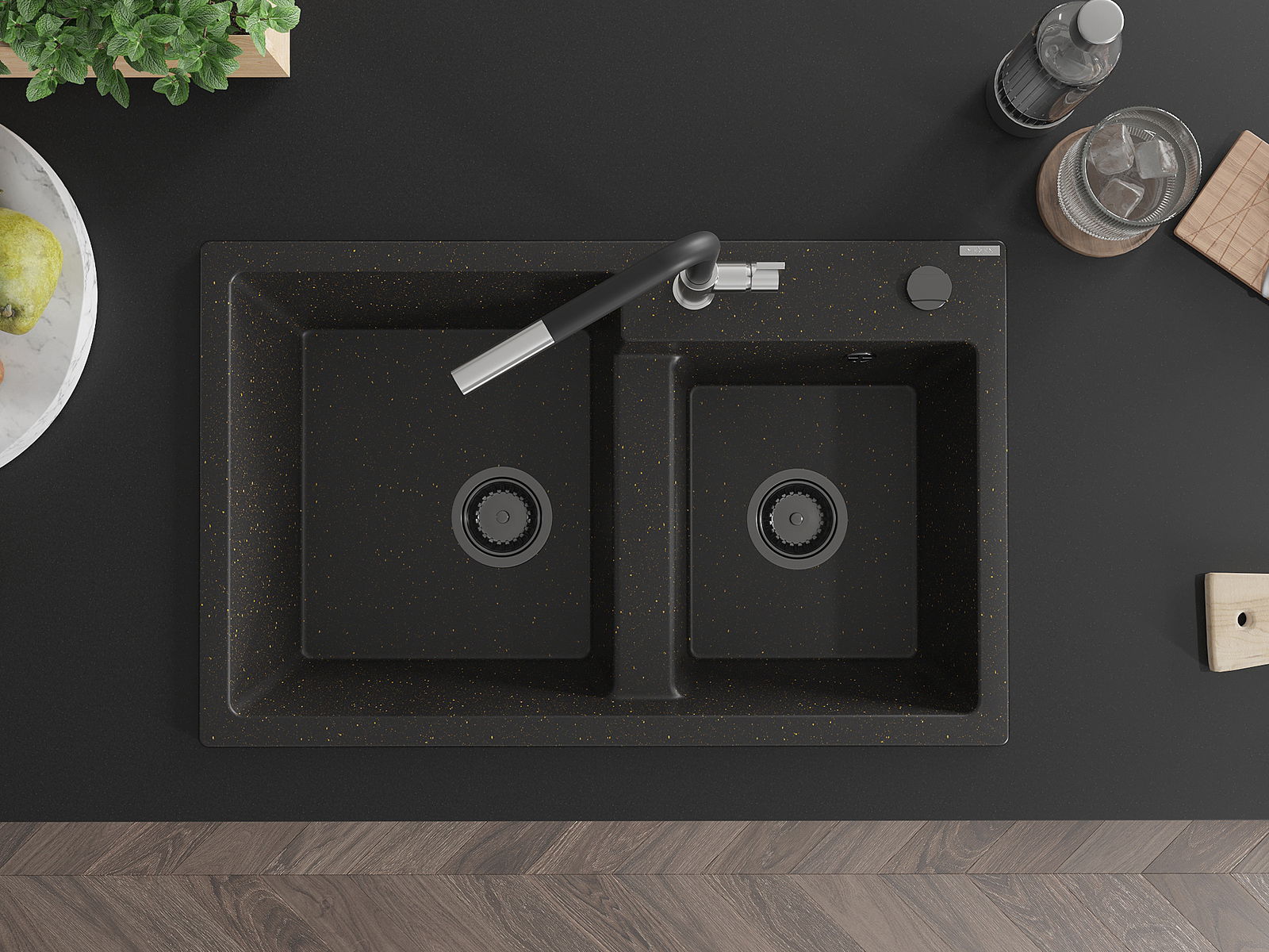 Mexen Tomas lavello in granito a 2 vasche con rubinetto da cucina Flora, nero/oro metallico - 6516-75-670401-07-B