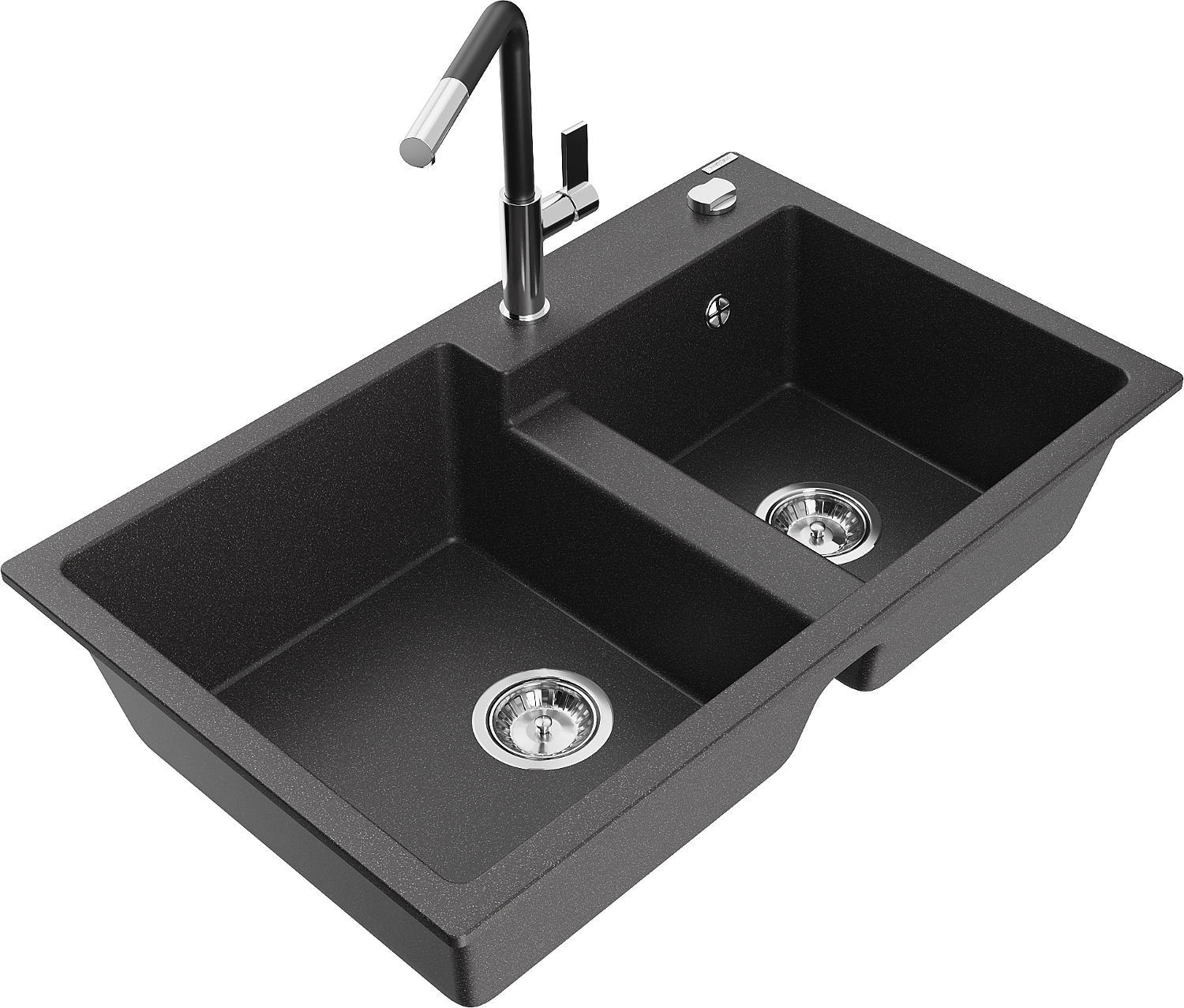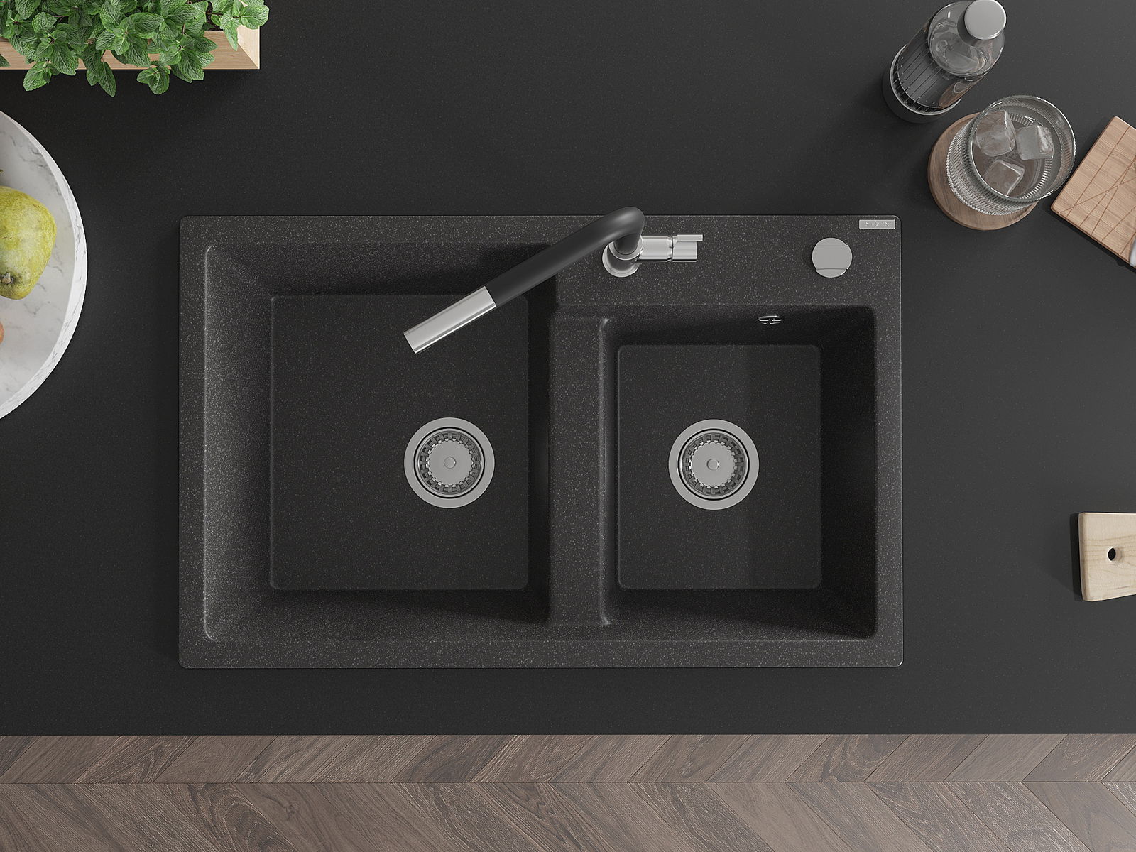 Mexen Tomas lavello in granito a 2 vasche con rubinetto da cucina Flora, nero maculato - 6516-76-670401-07