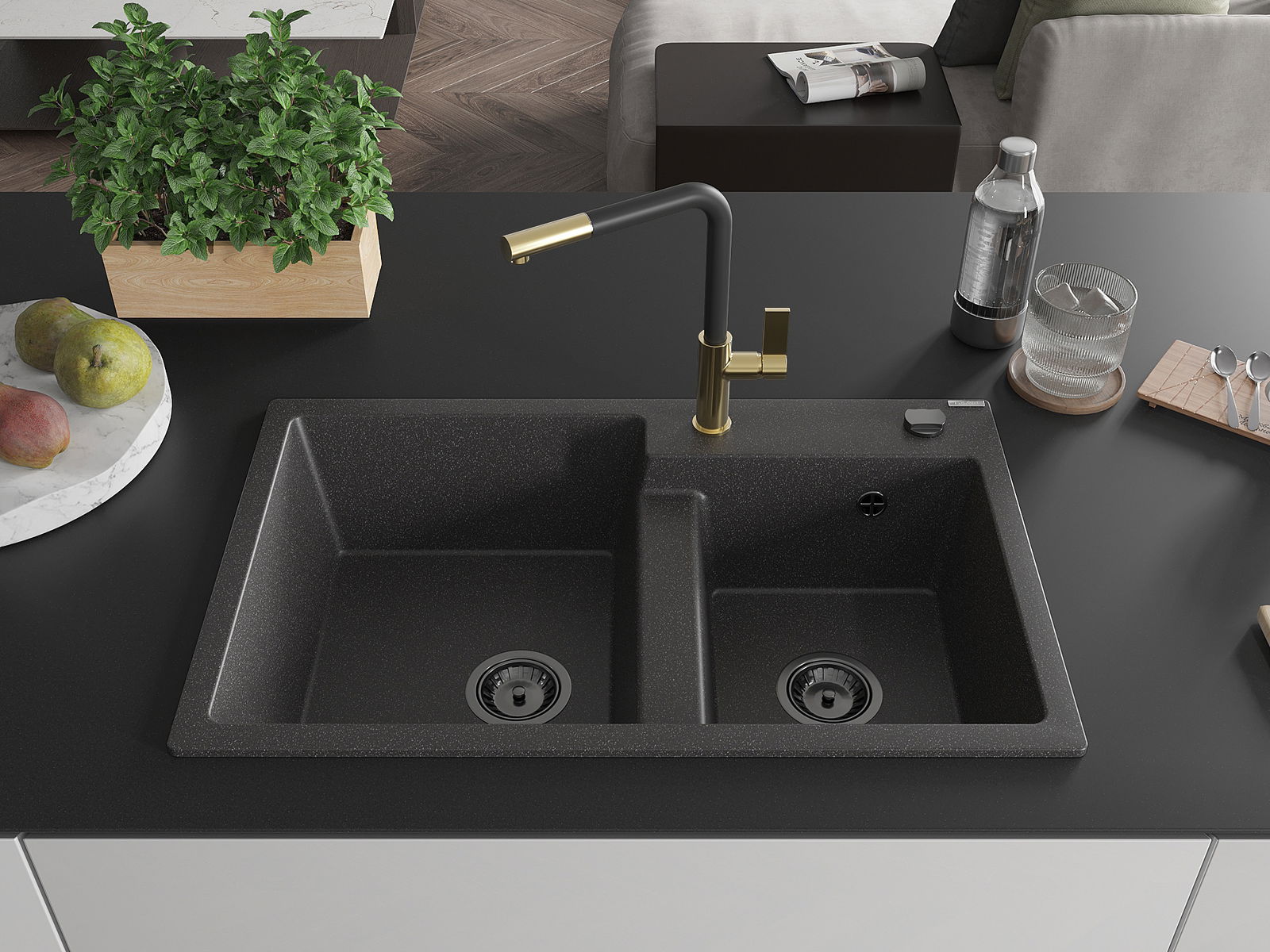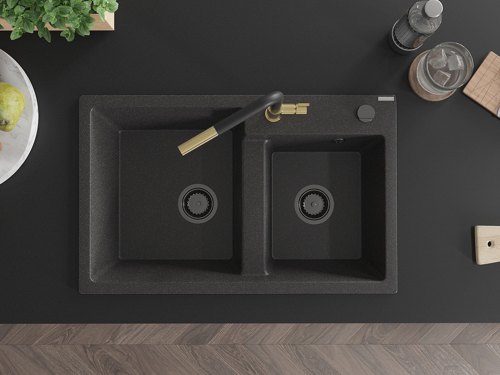 Mexen Tomas lavello in granito a 2 vasche con rubinetto da cucina Flora, nero macchiato - 6516-76-670401-57-B