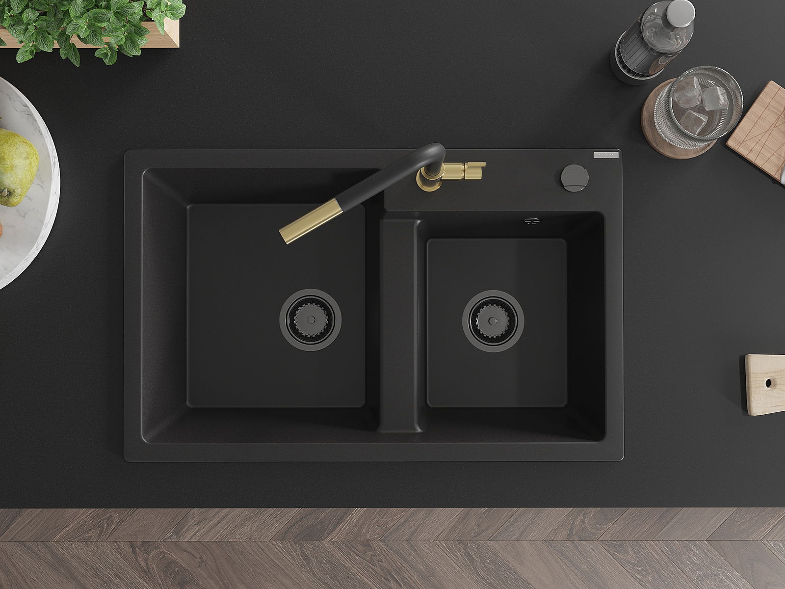 Mexen Tomas lavello da cucina in granito a 2 vasche con miscelatore Flora, nero - 6516-77-670401-57-B