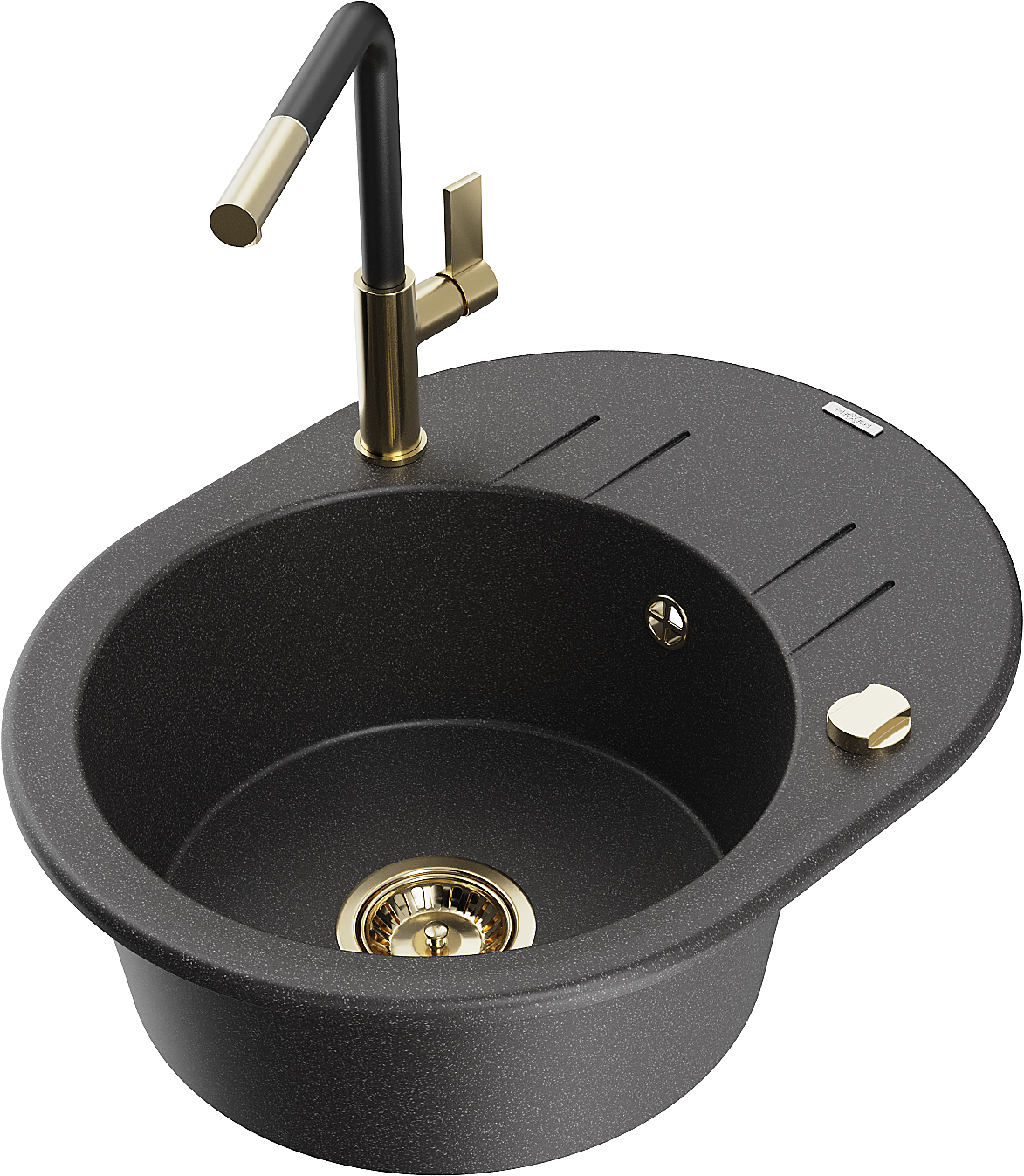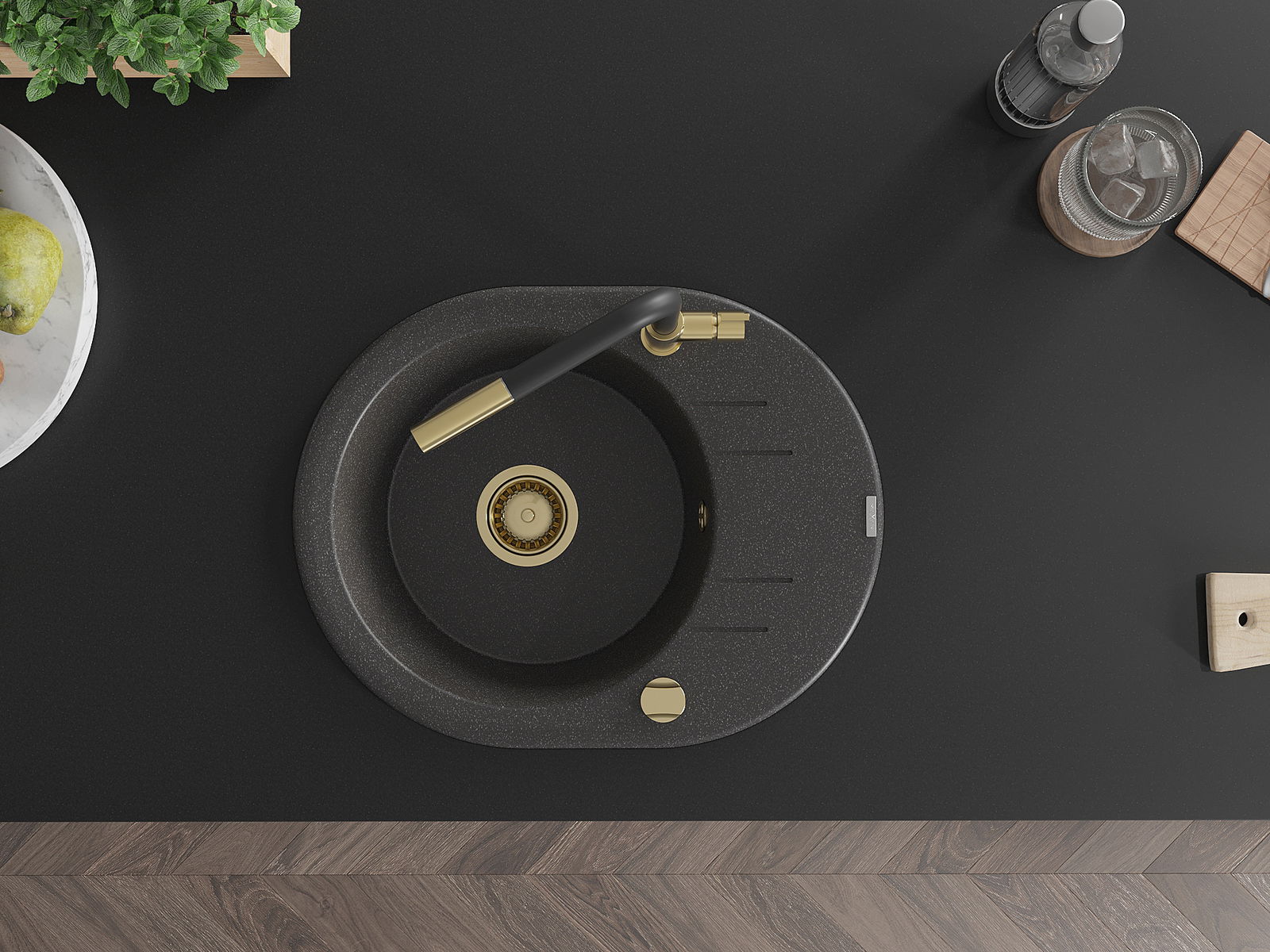 Mexen Kevin lavello in granito a 1 vasca con sgocciolatoio e rubinetto da cucina Flora, nero maculato - 6517-76-670401-57-G